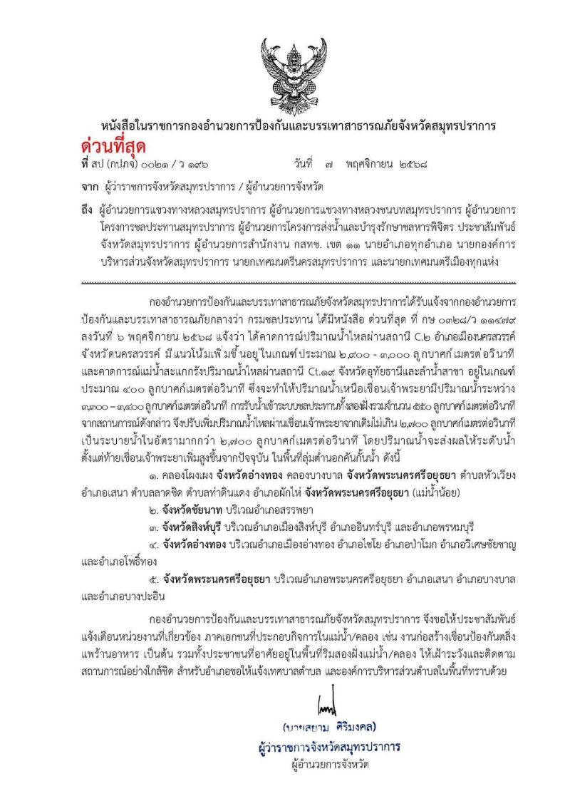 เตรียมความพร้อมเฝ้าระวังและติดตามสถานการณ์น้ำลุ่มน้ำเจ้าพระยา ประชาชนที่อาศัยอยู่ในพื้นที่ริมสองฝั่งแม่น้ำ/คลอง ให้เฝ้าระวังและติดตามสถานการณ์น้ำอย่างใกล้ชิด