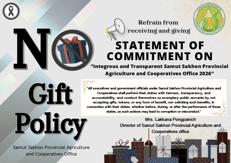 ประกาศดจตนารมณ์ "สุจริต โปร่งใส สมุทรสาคร ใสสะอาด 2569" และ "งดรับ งดให้" ของขวัญของกำนัลทุกชนิดจากการปฏิบัติหน้าที่ (No Gift Policy)