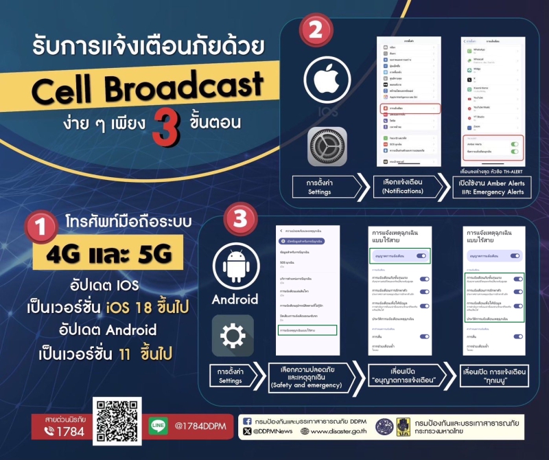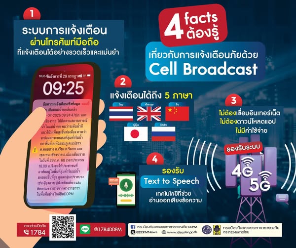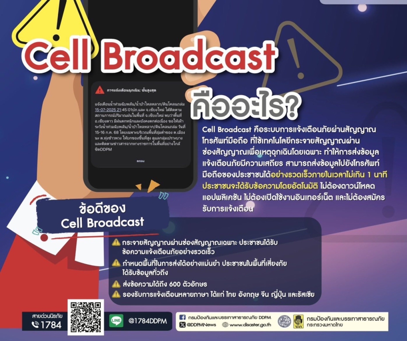 กรมป้องกันและบรรเทาสาธารณภัย ดำเนินการทดสอบระบบแจ้งเตือนภัยผ่านสัญญาณโทรศัพท์เคลื่อนที่ หรือ Cell Broadcast ไปยังโทรศัพท์เคลื่อนที่ “ทั่วประเทศ” ของผู้ให้บริการเครือข่ายทั้ง 3 ราย คือ บมจ.โทรคมนาคมแห่งชาติ บมจ.ทรูคอร์ปอเรชั่น และ บมจ.แอดวานซ์ อินโฟร์ เซอร์วิส อังคารที่ 20 มกราคม 2569 เวลา 14.00 น.