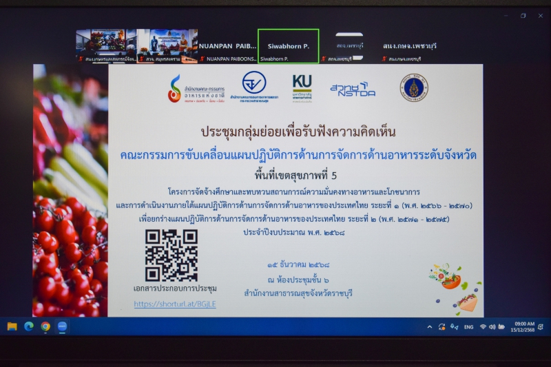 เมื่อวันที่ 15 ธันวาคม 2568 เวลา 09.00 น. นายประดิษฐ์ เกษมวิสิฐกุล เกษตรและสหกรณ์จังหวัดสมุทรสงคราม พร้อม นางสาวเบ็ญจมาศ อู่อ่อน หัวหน้ากลุ่มยุทธศาสตร์พัฒนาการเกษตร ว่าที่ร้อยตรี อานนท์ วิเศษสิงห์ หัวหน้ากลุ่มช่วยเหลือเกษตรกรและโครงการพิเศษ สำนักงานเกษตรและสหกรณ์จังหวัดสมุทรสงคราม ร่วมประชุมคณะกรรมการขับเคลื่อนแผนปฏิบัติการด้านการจัดการด้านอาหารของประเทศไทย ระดับจังหวัด ผ่านทางระบบออนไลน์ โดยมี นายพุทธพงษ์ สุริยะสิงห์ รองผู้ว่าราชการจังหวัดราชบุรี เป็นประธานเปิดการประชุม เพื่อรับฟังความคิดเห็นจากคณะกรรมการขับเคลื่อนแผนปฏิบัติการฯ ณ ห้องประชุมสำนักงานเกษตรและสหกรณ์จังหวัดสมุทรสงคราม ชั้น 4 ศาลากลางจังหวัดสมุทรสงคราม