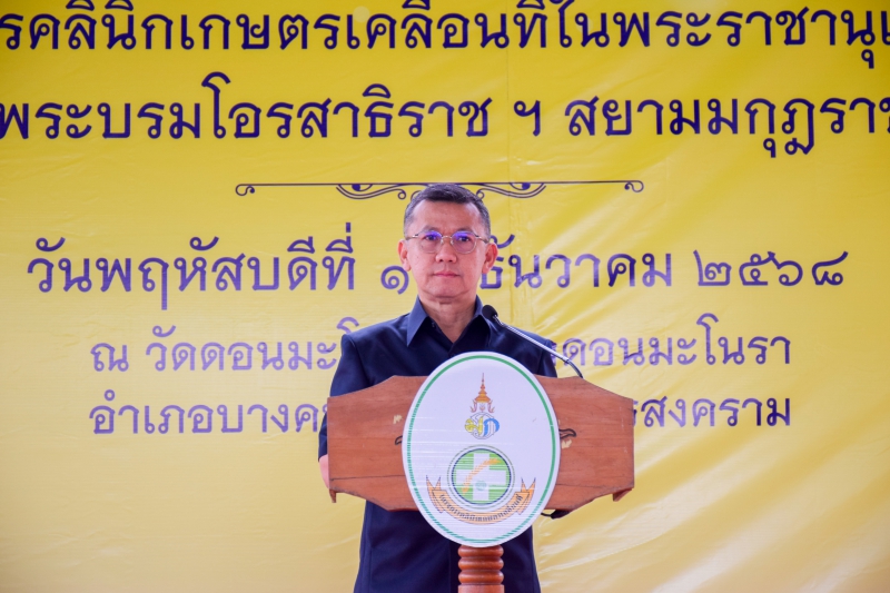 เมื่อวันที่ 18 ธันวาคม 2568 เวลา 09.00 น. นายประดิษฐ์ เกษมวิสิฐกุล เกษตรและสหกรณ์จังหวัดสมุทรสงคราม พร้อมนายวรวรรษ กระจ่างแจ่ม หัวหน้ากลุ่มสารสนเทศการเกษตร สำนักงานเกษตรและสหกรณ์จังหวัดสมุทรสงคราม ร่วมพิธีเปิดโครงการคลินิกเกษตรเคลื่อนที่ในพระราชานุเคราะห์ สมเด็จพระบรมโอรสาธิราช ฯ สยามมกุฎราชกุมาร ประจำปีงบประมาณ พ.ศ. 2569 ครั้งที่ 1 โดยมี โดยมี นายชยชัย แสงอินทร์ ผู้ว่าราชการจังหวัดสมุทรสงคราม เป็นประธาน นายประสิทธิ์ สิงห์ชา เกษตรจังหวัดสมุทรสงคราม กล่าวรายงาน จากนั้น เกษตรและสหกรณ์จังหวัด และเจ้าหน้าที่ฯ ออกหน่วยบริการคลินิกเกษตรและสหกรณ์ มีการสาธิตจากวิทยากรปราชญ์ชาวบ้าน ในการทำบอนไซมะพร้าวเพื่อเพิ่มมูลค่าผลผลิต วิธีการเลี้ยงไส้เดือน (ปุ๋ยมูลไส้เดือน) น้ำส้มควันไม้ จุลินทรีย์สังเคราะห์แสง แจกก้อนเชื้อเห็ดให้กับเกษตรกรและผู้สนใจ ประชาสัมพันธ์โครงการร้านอาหารวัตถุดิบปลอดภัยเลือกใช้สินค้า Q (Q-Restaurant) โครงการส่งเสริมการบริโภคและใช้วัตถุดิบสินค้า Q จังหวัดสมุทรสงคราม เกษตรพันธสัญญา พร้อมทั้งบริการคลินิกรับปรึกษาปัญหาเกษตรกร แจกเอกสารและให้คำแนะนำกองทุนสงเคราะห์เกษตรกร กองทุนหมุนเวียนเพื่อการกู้ยืมแก่เกษตรกรและผู้ยากจน เพื่อให้เกษตรกรได้เข้าถึงแหล่งทุน สร้างการรับรู้ หยุดเผา ในพื้นที่การเกษตร เพื่อเป็นการลดปัญหาฝุ่นละอองขนาดเล็กไม่เกิน 2.5 ไมครอน (PM2.5) ภาคการเกษตร ณ วัดดอนมะโนรา ตำบลดอนมะโนรา อำเภอบางคนที จังหวัดสมุทรสงคราม