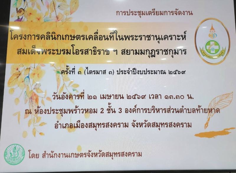 เมื่อวันที่ 21 เมษายน 2569 เวลา 13.30 น. นายประดิษฐ์ เกษมวิสิฐกุล เกษตรและสหกรณ์จังหวัดสมุทรสงคราม มอบ นายวรวรรษ กระจ่างแจ่ม หัวหน้ากลุ่มสารสนเทศการเกษตร สำนักงานเกษตรและสหกรณ์จังหวัดสมุทรสงคราม และเจ้าหน้าที่ ร่วมประชุมเตรียมการจัดงานโครงการคลินิกเกษตรเคลื่อนที่ในพระราชานุเคราะห์ สมเด็จพระบรมโอรสาธิราช ฯ สยามมกุฎราชกุมาร ครั้งที่ 3 ประจำปีงบประมาณ พ.ศ. 2569 เพื่อหารือและวางแผนเตรียมการจัดงานโครงการดังกล่าวฯ เพื่อให้เกษตรกรได้บริการทางด้านการเกษตรอย่างครบถ้วน ณ ห้องประชุมพร้าวหอม 2 องค์การบริหารส่วนตำบลท้ายหาด ต.ท้ายหาด อ.เมืองฯ จ.สมุทรสงคราม โดยมีนายอรรคพล งามเผือก นายกองค์การบริหารส่วนตำบลท้ายหาด เป็นประธาน โดยกำหนดจัดงานฯ ในวันพฤหัสบดีที่ 21 พฤษภาคม 2569 ณ วัดท้ายหาด ต.ท้ายหาด อ.เมืองฯ จ.สมุทรสงคราม