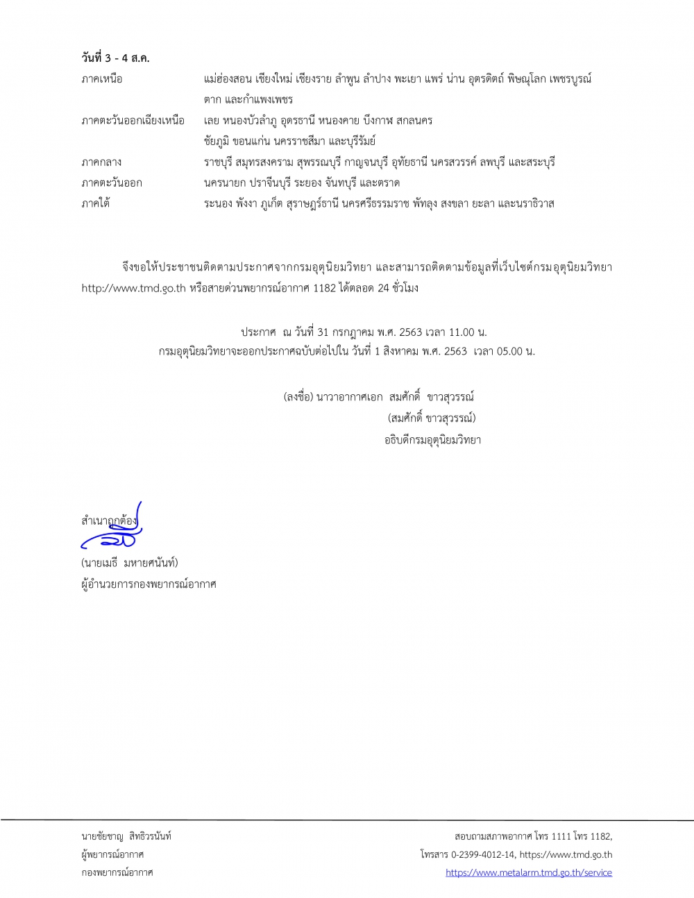 ประกาศกรมอุตุนิยมวิทยา เรื่อง พายุระดับ 2 (ดีเปรสชัน) ในบริเวณทะเลจีนใต้ตอนบน ฉบับที่ 1 (142/2563) มีผลกระทบถึงวันที่ 4 สิงหาคม 2563)