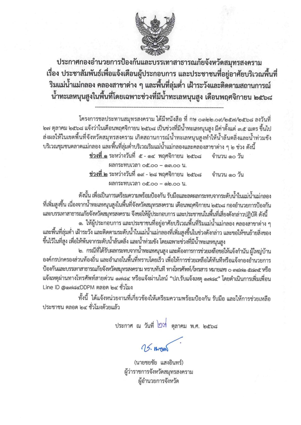 ประชาสัมพันธ์ ประกาศกองอำนวยการป้องกันและบรรเทาสาธารณภัยจังหวัดสมุทรสงคราม เรื่อง ประชาสัมพันธ์เพื่อแจ้งเตือนผู้ประกอบการ และประชาชนที่อยู่อาศัยบริเวณพื้นที่ริมแม่น้ำแม่กลอง คลองสาขาต่างๆ และพื้นที่ลุ่มต่ำ เฝ้าระวังและติดตามสถานการณ์น้ำทะเลหนุนสูงในพื้นที