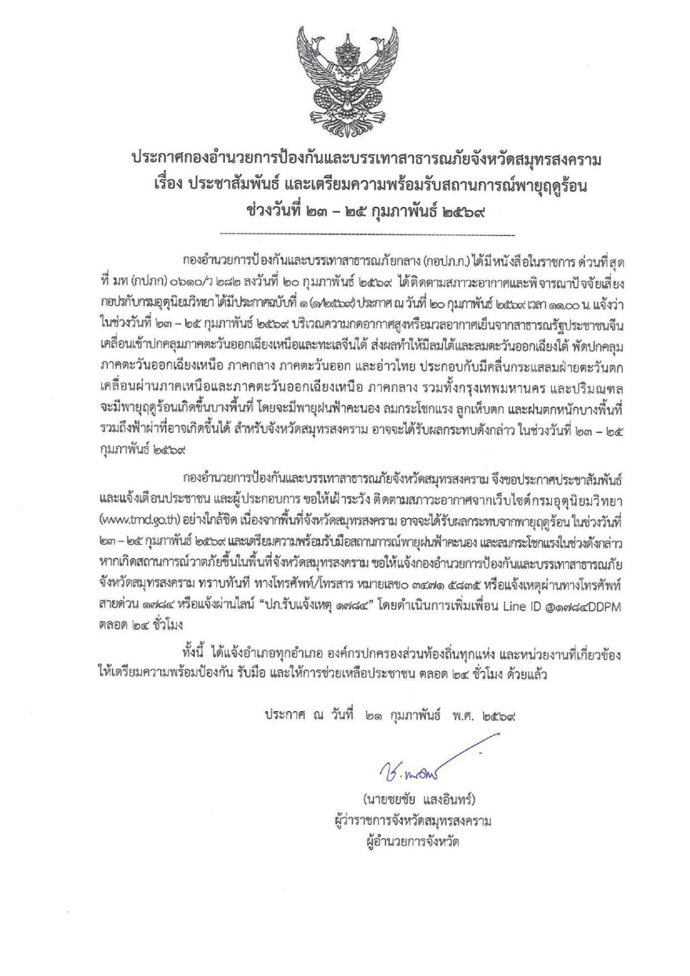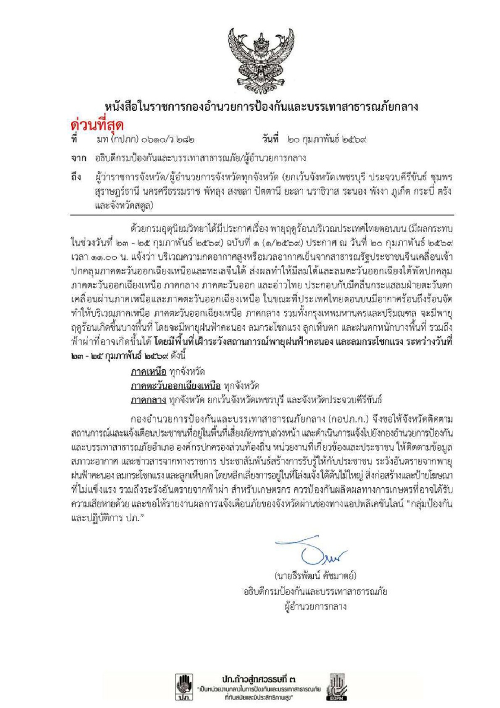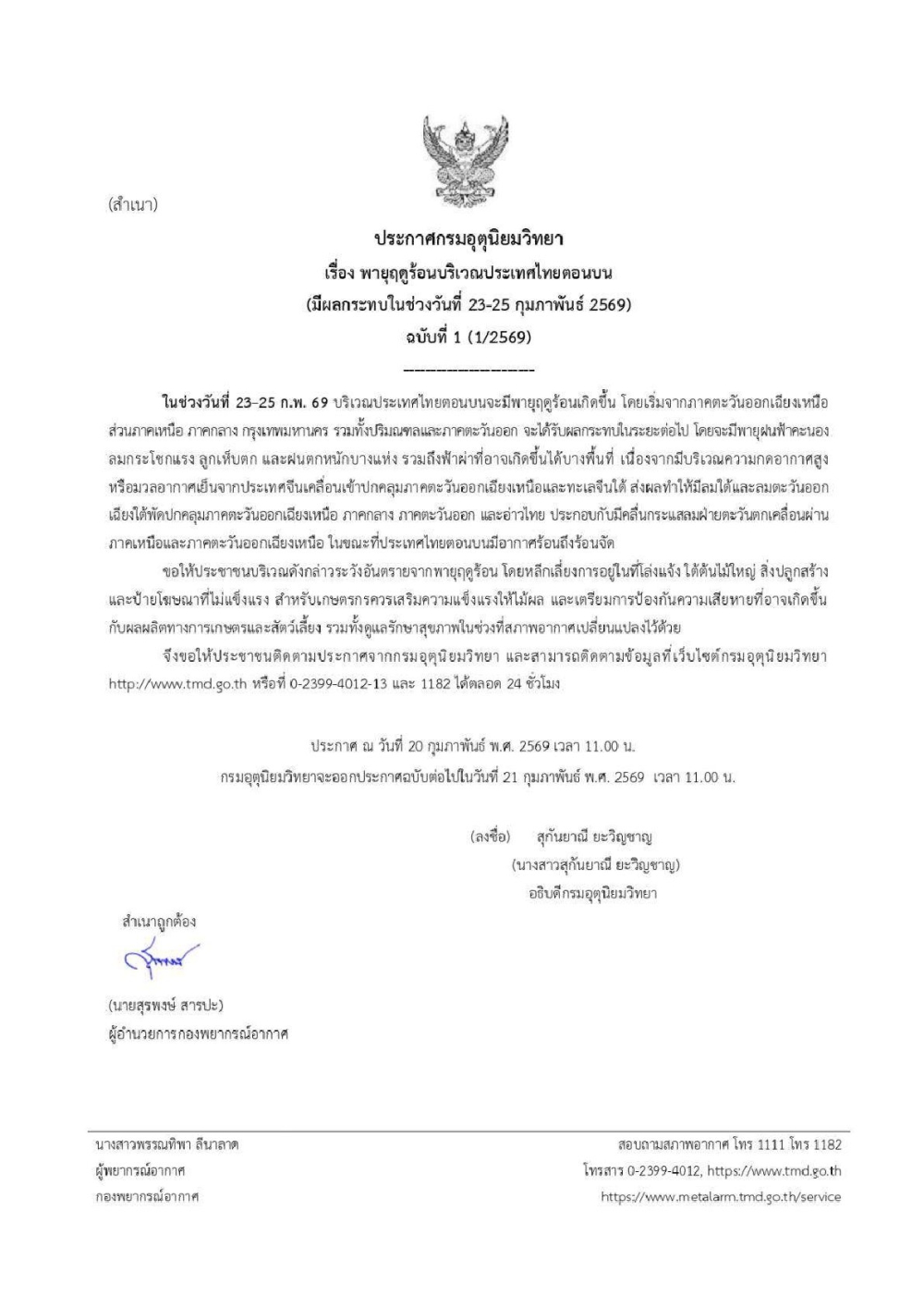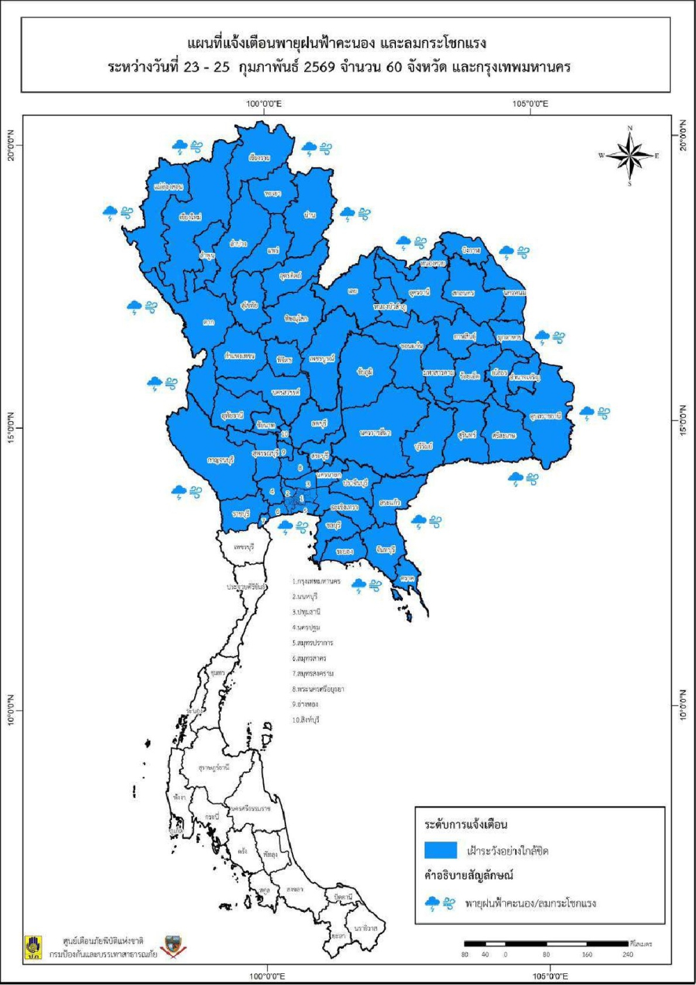 ประชาสัมพันธ์ แจ้งเตือนพายุฤดูร้อนบริเวณประเทศไทยตอนบน (มีผลกระทบในช่วงวันที่ 23-25 กุมภาพันธ์ 2569) ฉบับที่ 1