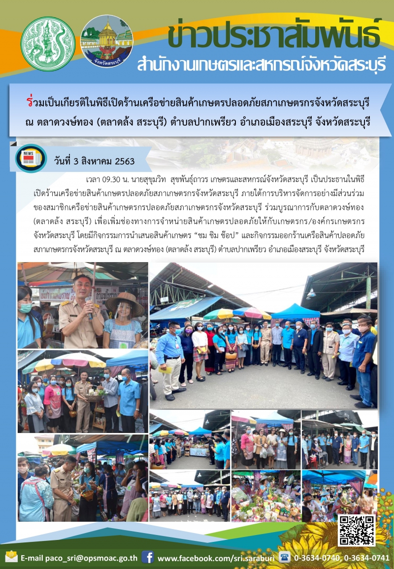 วันที่ 3 สิงหาคม 2563 เวลา 09.30 น. นายสุขุมวิท สุขพันธุ์ถาวร เกษตรและสหกรณ์จังหวัดสระบุรี เป็นประธานในพิธี เปิดร้านเครือข่ายสินค้าเกษตรปลอดภัยสภาเกษตรกรจังหวัดสระบุรี ภายใต้การบริหารจัดการอย่างมีส่วนร่วม ของสมาชิกเครือข่ายสินค้าเกษตรกรปลอดภัยสภาเกษตรกรจังหวัดสระบุรี ร่วมบูรณาการกับตลาดวงษ์ทอง (ตลาดล้ง สระบุรี) เพื่อเพิ่มช่องทางการจําหน่ายสินค้าเกษตรปลอดภัยให้กับเกษตรกร/องค์กรเกษตรกร จังหวัดสระบุรี โดยมีกิจกรรมการนําเสนอสินค้าเกษตร “ชม ชิม ช็อป” และกิจกรรมออกร้านเครือสินค้าปลอดภัย สภาเกษตรกรจังหวัดสระบุรี ณ ตลาดวงษ์ทอง (ตลาดล้ง สระบุรี) ตําบลปากเพรียว อําเภอเมืองสระบุรี จังหวัดสระบุรี