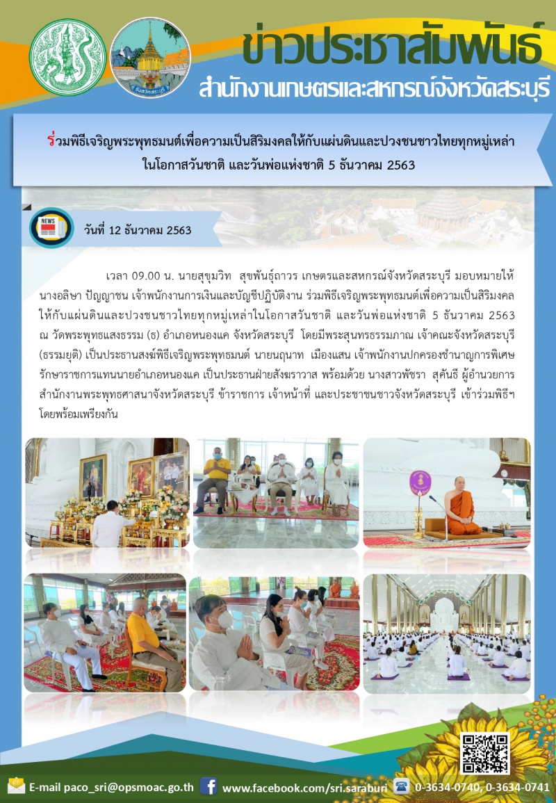 วันที่ 12 ธันวาคม 2563 เวลา 09.00 น. นายสุขุมวิท สุขพันธุ์ถาวร เกษตรและสหกรณ์จังหวัดสระบุรี มอบหมายให้ นางอลิษา ปัญญาชน เจ้าพนักงานการเงินและบัญชีปฏิบัติงาน ร่วมพิธีเจริญพระพุทธมนต์เพื่อความเป็นสิริมงคล ให้กับแผ่นดินและปวงชนชาวไทยทุกหมู่เหล่าในโอกาสวันชาติ และวันพ่อแห่งชาติ 5 ธันวาคม 2563 ณ วัดพระพุทธแสงธรรม (ธ) อําเภอหนองแค จังหวัดสระบุรี โดยมีพระสุนทรธรรมภาณ เจ้าคณะจังหวัดสระบุรี (ธรรมยุต) เป็นประธานสงฆ์พิธีเจริญพระพุทธมนต์ นายนฤนาท เมืองแสน เจ้าพนักงานปกครองชํานาญการพิเศษ รักษาราชการแทนนายอําเภอหนองแค เป็นประธานฝ่ายสังฆราวาส พร้อมด้วย นางสาวพัชรา สุคันธี ผู้อํานวยการ สํานักงานพระพุทธศาสนาจังหวัดสระบุรี ข้าราชการ เจ้าหน้าที่ และประชาชนชาวจังหวัดสระบุรี เข้าร่วมพิธีฯ โดยพร้อมเพรียงกัน