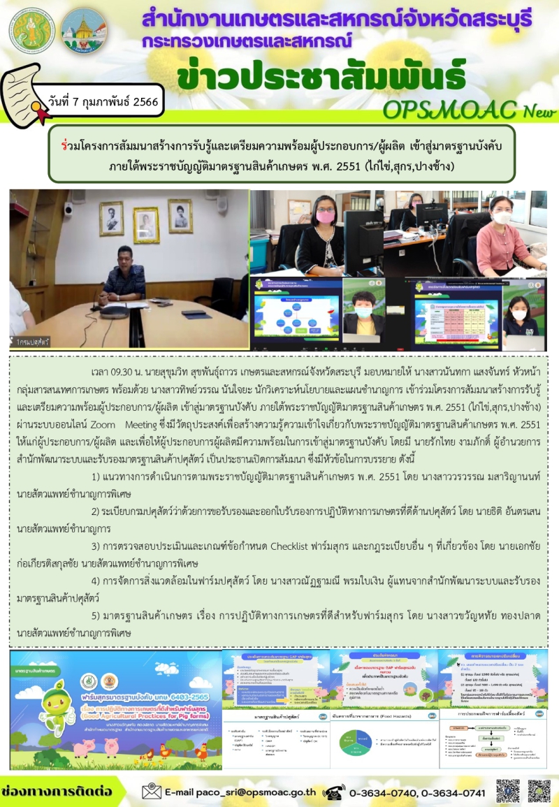 วันที่ 7 กุมภาพันธ์ 2566 เวลา 09.30 น. นายสุขุมวิท สุขพันธุ์ถาวร เกษตรและสหกรณ์จังหวัดสระบุรี มอบหมายให้ นางสาวนันทกา แสงจันทร์ หัวหน้ากลุ่มสารสนเทศการเกษตร พร้อมด้วย นางสาวทิพย์วรรณ นันใจยะ นักวิเคราะห์นโยบายและแผนชำนาญการ เข้าร่วมโครงการสัมมนาสร้างการรับรู้ และเตรียมความพร้อมผู้ประกอบการ/ผู้ผลิต เข้าสู่มาตรฐานบังคับ