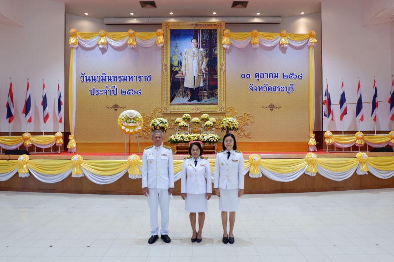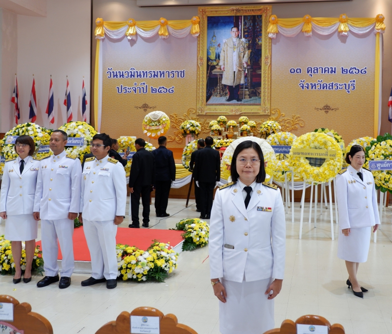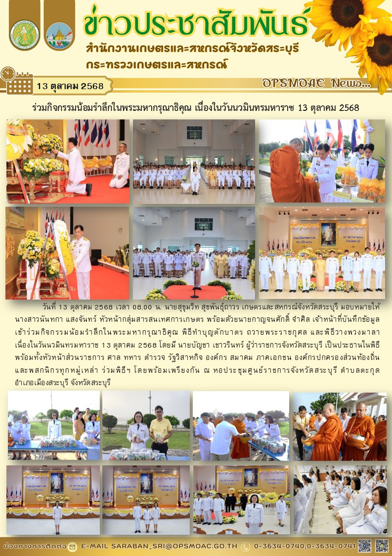 วันที่ 13 ตุลาคม 2568 เวลา 08.00 น. นายสุขุมวิท สุขพันธุ์ถาวร เกษตรและสหกรณ์จังหวัดสระบุรี มอบหมายให้ นางสาวนันทกา แสงจันทร์ หัวหน้ากลุ่สารสนเทศการเกษตร พร้อมด้วยนายกาญจนศักดิ์ จำศิล เจ้าหน้าที่บันทึกข้อมูล เข้าร่วมกิจกรรมน้อมรำลึกในพระมหากรุณาธิคุณ พิธีทำบุญตักบาตร ถวายพระราชกุศล และพิธีวางพวงมาลา เนื่องในวันนวมินทรมหาราช 13 ตุลาคม 2568 โดยมี นายบัญชา เชาวรินทร์ ผู้ว่าราชการจังหวัดสระบุรี เป็นประธานในพิธี พร้อมทั้งหัวหน้าส่วนราชการ ศาล ทหาร ตำรวจ รัฐวิสาหกิจ องค์กร สมาคม ภาคเอกชน องค์กรปกครองส่วนท้องถิ่น และพสกนิกรทุกหมู่เหล่า ร่วมพิธีฯ โดยพร้อมเพรียงกัน ณ หอประชุมศูนย์ราชการจังหวัดสระบุรี ตำบลตะกุด อำเภอเมืองสระบุรี จังหวัดสระบุรี