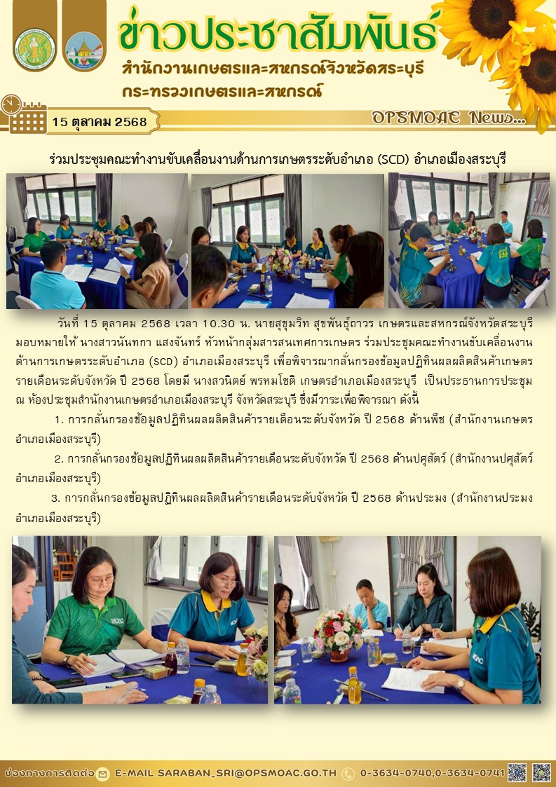 วันที่ 15 ตุลาคม 2568 เวลา 10.30 น. นายสุขุมวิท สุขพันธุ์ถาวร เกษตรและสหกรณ์จังหวัดสระบุรี มอบหมายให้ นางสาวนันทกา แสงจันทร์ หัวหน้ากลุ่มสารสนเทศการเกษตร ร่วมประชุมคณะทำงานขับเคลื่อนงาน ด้านการเกษตรระดับอำเภอ (SCD) อำเภอเมืองสระบุรี เพื่อพิจารณากลั่นกรองข้อมูลปฏิทินผลผลิตสินค้าเกษตร รายเดือนระดับจังหวัด ปี 2568 โดยมี นางสวนิตย์ พรหมโชติ เกษตรอำเภอเมืองสระบุรี เป็นประธานการประชุม ณ ห้องประชุมสำนักงานเกษตรอำเภอเมืองสระบุรี จังหวัดสระบุรี ซึ่งมีวาระเพื่อพิจารณา ดังนี้