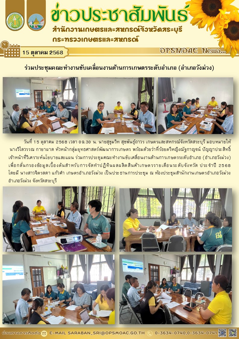 วันที่ 15 ตุลาคม 2568 เวลา 09.30 น. นายสุขุมวิท สุขพันธุ์ถาวร เกษตรและสหกรณ์จังหวัดสระบุรี มอบหมายให้ นางวิไลวรรณ กายาผาด หัวหน้ากลุ่มยุทธศาสตร์พัฒนาการเกษตร พร้อมด้วยว่าที่ร้อยตรีหญิงณัฐกาญจน์ ปัญญาประสิทธิ์ เจ้าหน้าที่วิเคราะห์นโยบายและแผน ร่วมการประชุมคณะทำงานขับเคลื่อนงานด้านการเกษตรระดับอำเภอ (อำเภอวังม่วง) เพื่อกลั่นกรองข้อมูลเบื้องต้นสำหรับการจัดทำปฏิทินผลผลิตสินค้าเกษตรรายเดือนระดับจังหวัด ประจำปี 2568 โดยมี นางสาวจิตรลดา แก้วคำ เกษตรอำเภอวังม่วง เป็นประธานการประชุม ณ ห้องประชุมสำนักงานเกษตรอำเภอวังม่วง อำเภอวังม่วง จังหวัดสระบุรี