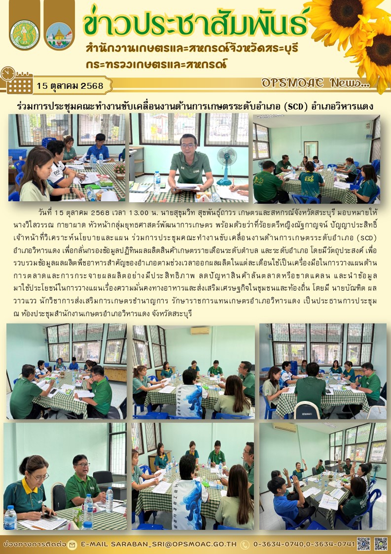 วันที่ 15 ตุลาคม 2568 เวลา 13.00 น. นายสุขุมวิท สุขพันธุ์ถาวร เกษตรและสหกรณ์จังหวัดสระบุรี มอบหมายให้ นางวิไลวรรณ กายาผาด หัวหน้ากลุ่มยุทธศาสตร์พัฒนาการเกษตร พร้อมด้วยว่าที่ร้อยตรีหญิงณัฐกาญจน์ ปัญญาประสิทธิ์ เจ้าหน้าที่วิเคราะห์นโยบายและแผน ร่วมการประชุมคณะทำงานขับเคลื่อนงานด้านการเกษตรระดับอำเภอ (SCD) อำเภอวิหารแดง เพื่อกลั่นกรองข้อมูลปฏิทินผลผลิตสินค้าเกษตรรายเดือนระดับตำบล และระดับอำเภอ โดยมีวัตถุประสงค์ เพื่อรวบรวมข้อมูลผลผลิตพืชอาหารสำคัญของอำเภอตามช่วงเวลาออกผลผลิตในแต่ละเดือนใช้เป็นเครื่องมือในการวางแผนด้านการตลาดและการกระจายผลผลิตอย่างมีประสิทธิภาพ ลดปัญหาสินค้าล้นตลาดหรือขาดแคลน และนำข้อมูล มาใช้ประโยชน์ในการวางแผนเรื่องความมั่นคงทางอาหารและส่งเสริมเศรษฐกิจในชุมชนและท้องถิ่น โดยมี นายบัณฑิต ผลวาวแวว นักวิชาการส่งเสริมการเกษตรชำนาญการ รักษาราชการแทนเกษตรอำเภอวิหารแดง เป็นประธานการประชุม ณ ห้องประชุมสำนักงานเกษตรอำเภอวิหารแดง จังหวัดสระบุรี