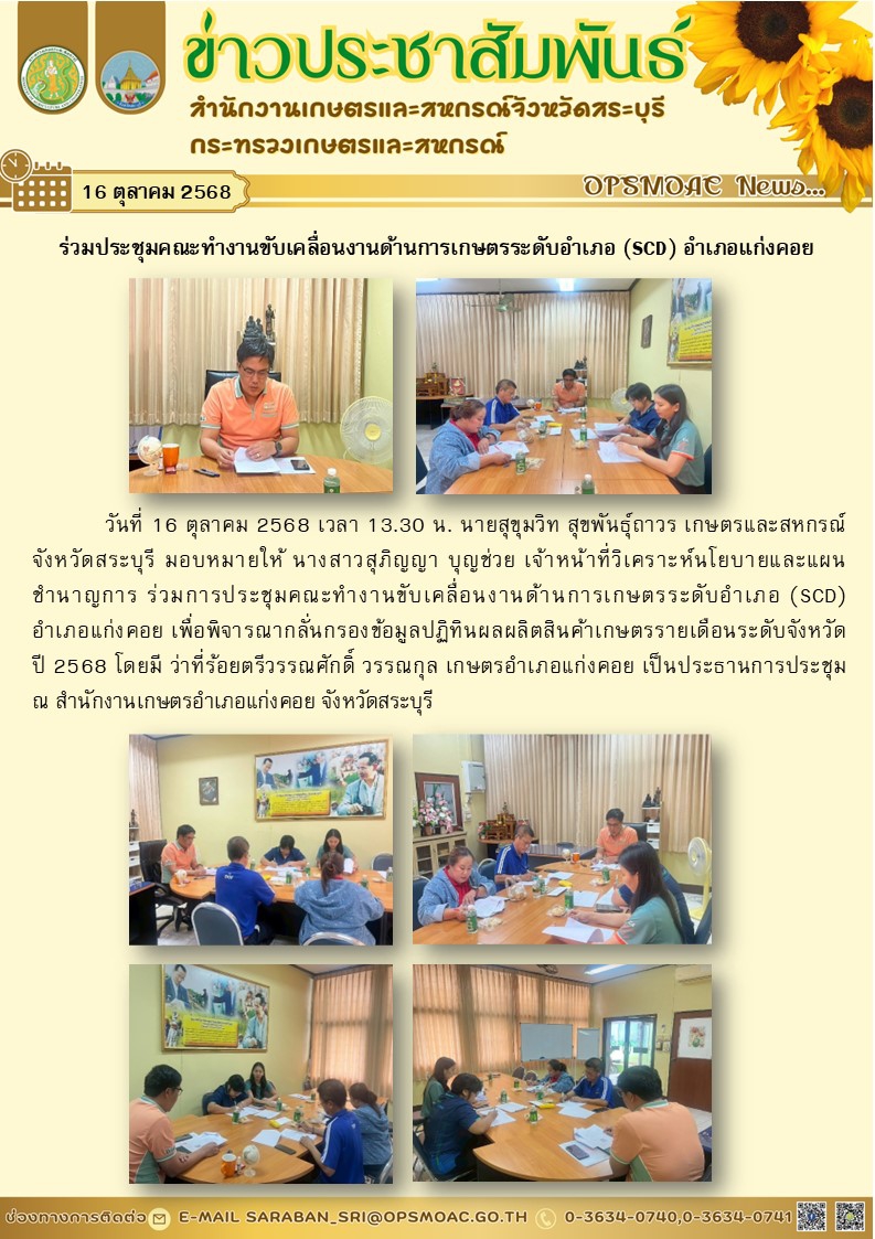 วันที่ 16 ตุลาคม 2568 เวลา 13.30 น. นายสุขุมวิท สุขพันธุ์ถาวร เกษตรและสหกรณ์จังหวัดสระบุรี มอบหมายให้ นางสาวสุภิญญา บุญช่วย เจ้าหน้าที่วิเคราะห์นโยบายและแผนชำนาญการ ร่วมการประชุมคณะทำงานขับเคลื่อนงานด้านการเกษตรระดับอำเภอ (SCD) อำเภอแก่งคอย เพื่อพิจารณากลั่นกรองข้อมูลปฏิทินผลผลิตสินค้าเกษตรรายเดือนระดับจังหวัด ปี 2568 โดยมี ว่าที่ร้อยตรีวรรณศักดิ์ วรรณกุล เกษตรอำเภอแก่งคอย เป็นประธานการประชุม ณ สำนักงานเกษตรอำเภอแก่งคอย จังหวัดสระบุรี