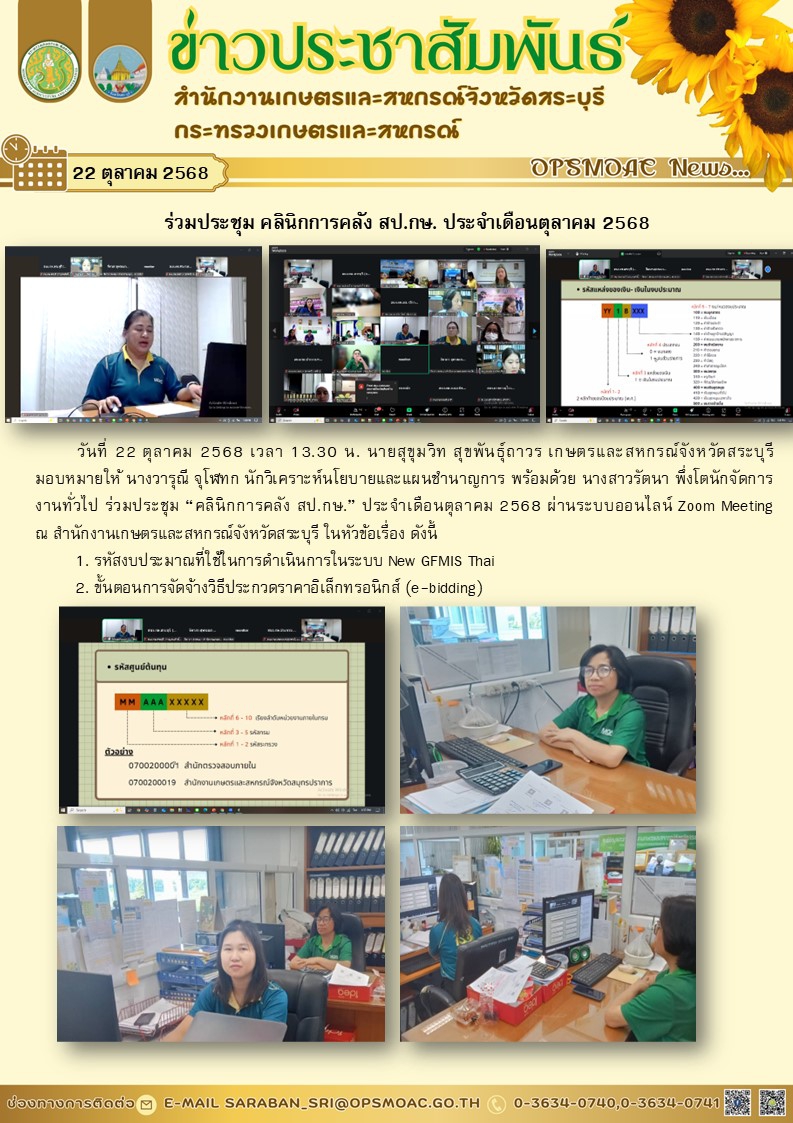 วันที่ 22 ตุลาคม 2568 เวลา 13.30 น. นายสุขุมวิท สุขพันธุ์ถาวร เกษตรและสหกรณ์จังหวัดสระบุรี มอบหมายให้ นางวารุณี จุโฬทก นักวิเคราะห์นโยบายและแผนชำนาญการ พร้อมด้วย นางสาวรัตนา พึ่งโตนักจัดการงานทั่วไป ร่วมประชุม “คลินิกการคลัง สป.กษ.” ประจำเดือนตุลาคม 2568 ผ่านระบบออนไลน์ Zoom Meeting