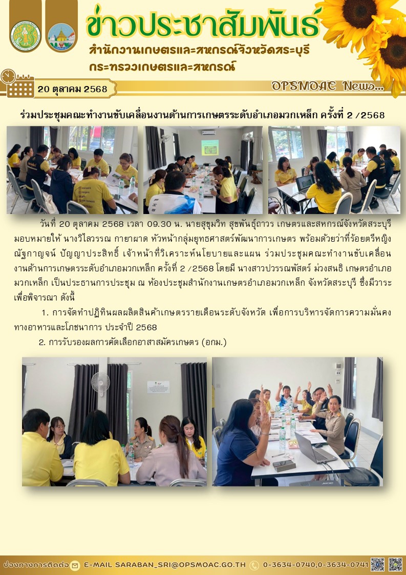 วันที่ 20 ตุลาคม 2568 เวลา 09.30 น. นายสุขุมวิท สุขพันธุ์ถาวร เกษตรและสหกรณ์จังหวัดสระบุรี มอบหมายให้ นางวิไลวรรณ กายาผาด หัวหน้ากลุ่มยุทธศาสตร์พัฒนาการเกษตร พร้อมด้วยว่าที่ร้อยตรีหญิงณัฐกาญจน์ ปัญญาประสิทธิ์ เจ้าหน้าที่วิเคราะห์นโยบายและแผน ร่วมประชุมคณะทำงานขับเคลื่อน งานด้านการเกษตรระดับอำเภอมวกเหล็ก ครั้งที่ 2 /2568 โดยมี นางสาวปวรรณพัสตร์ ม่วงสนธิ เกษตรอำเภอมวกเหล็ก เป็นประธานการประชุม ณ ห้องประชุมสำนักงานเกษตรอำเภอมวกเหล็ก จังหวัดสระบุรี ซึ่งมีวาระ เพื่อพิจารณา ดังนี้