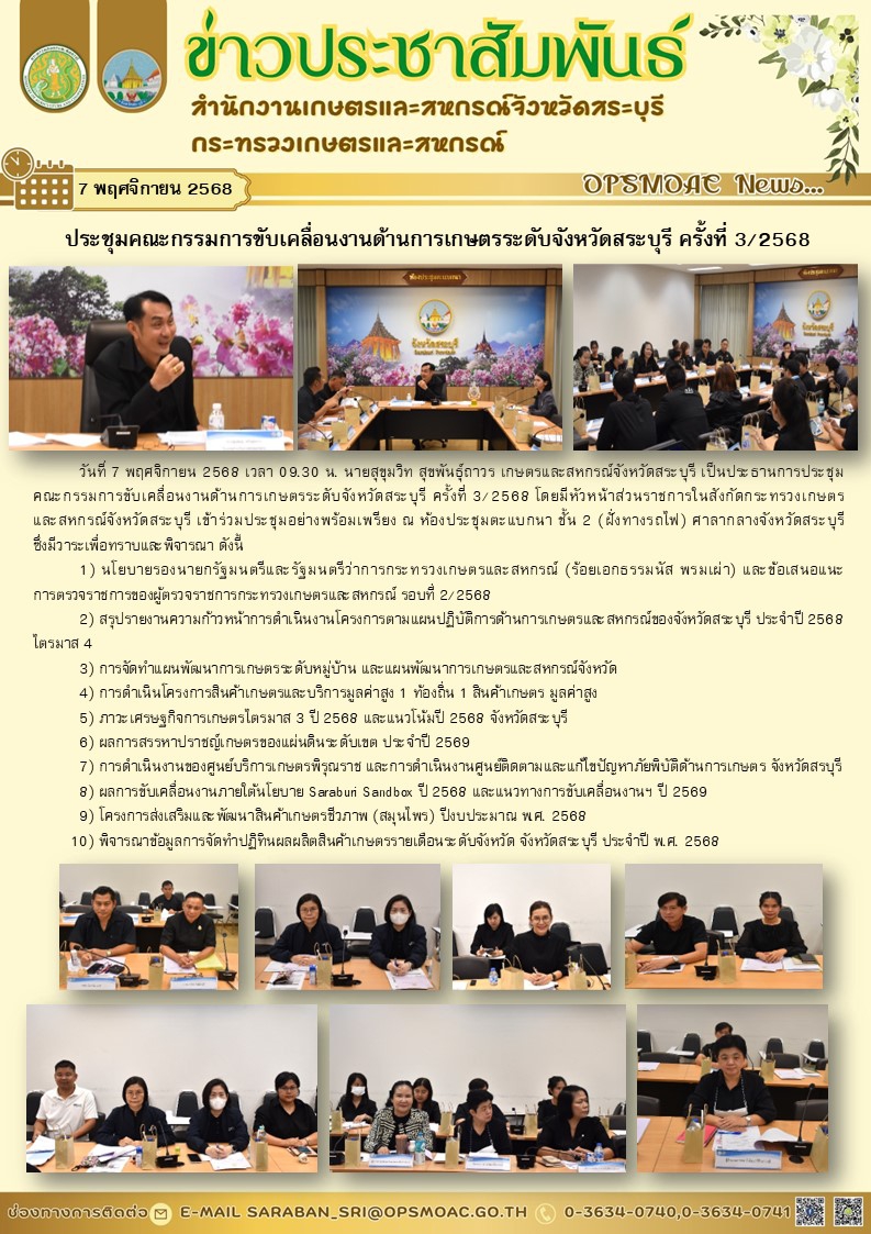 วันที่ 7 พฤศจิกายน 2568 เวลา 09.30 น. นายสุขุมวิท สุขพันธุ์ถาวร เกษตรและสหกรณ์จังหวัดสระบุรี เป็นประธานการประชุมคณะกรรมการขับเคลื่อนงานด้านการเกษตรระดับจังหวัดสระบุรี ครั้งที่ 3/2568 โดยมีหัวหน้าส่วนราชการในสังกัดกระทรวงเกษตร และสหกรณ์จังหวัดสระบุรี เข้าร่วมประชุมอย่างพร้อมเพรียง ณ ห้องประชุมตะแบกนา ชั้น 2 (ฝั่งทางรถไฟ) ศาลากลางจังหวัดสระบุรี ซึ่งมีวาระเพื่อทราบและพิจารณา ดังนี้