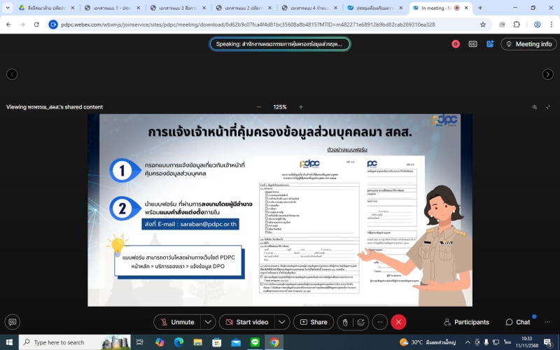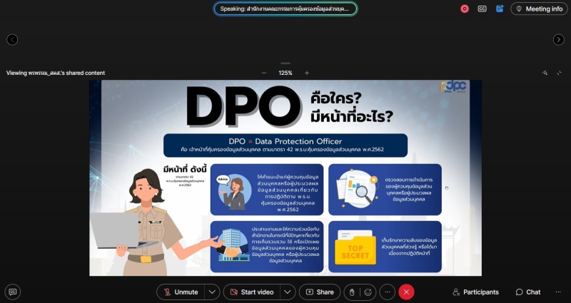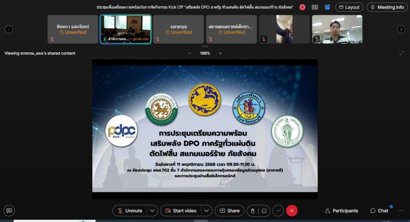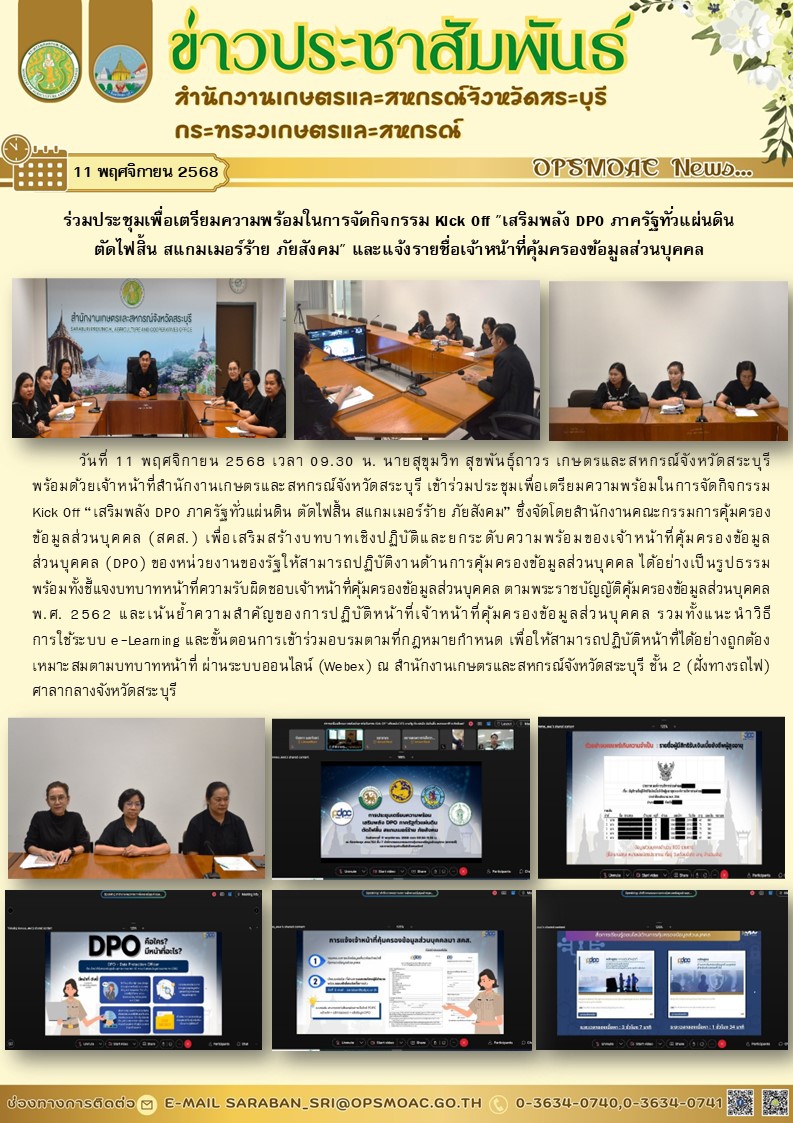 วันที่ 11 พฤศจิกายน 2568 เวลา 09.30 น. นายสุขุมวิท สุขพันธุ์ถาวร เกษตรและสหกรณ์จังหวัดสระบุรี พร้อมด้วยเจ้าหน้าที่สำนักงานเกษตรและสหกรณ์จังหวัดสระบุรี เข้าร่วมประชุมเพื่อเตรียมความพร้อมในการจัดกิจกรรม Kick Off “เสริมพลัง DPO ภาครัฐทั่วแผ่นดิน ตัดไฟสิ้น สแกมเมอร์ร้าย ภัยสังคม” ซึ่งจัดโดยสำนักงานคณะกรรมการคุ้มครองข้อมูลส่วนบุคคล (สคส.) เพื่อเสริมสร้างบทบาทเชิงปฏิบัติและยกระดับความพร้อมของเจ้าหน้าที่คุ้มครองข้อมูล ส่วนบุคคล (DPO) ของหน่วยงานของรัฐให้สามารถปฏิบัติงานด้านการคุ้มครองข้อมูลส่วนบุคคล ได้อย่างเป็นรูปธรรม พร้อมทั้งชี้แจงบทบาทหน้าที่ความรับผิดชอบเจ้าหน้าที่คุ้มครองข้อมูลส่วนบุคคล ตามพระราชบัญญัติคุ้มครองข้อมูลส่วนบุคคล พ.ศ. 2562 และเน้นย้ำความสำคัญของการปฏิบัติหน้าที่เจ้าหน้าที่คุ้มครองข้อมูลส่วนบุคคล รวมทั้งแนะนำวิธี การใช้ระบบ e-Learning และขั้นตอนการเข้าร่วมอบรมตามที่กฎหมายกำหนด เพื่อให้สามารถปฏิบัติหน้าที่ได้อย่างถูกต้อง เหมาะสมตามบทบาทหน้าที่ ผ่านระบบออนไลน์ (Webex) ณ สำนักงานเกษตรและสหกรณ์จังหวัดสระบุรี ชั้น 2 (ฝั่งทางรถไฟ) ศาลากลางจังหวัดสระบุรี