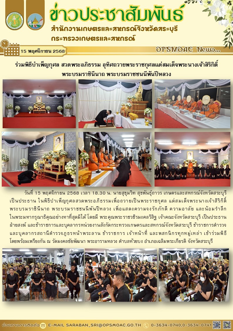 วันที่ 15 พฤศจิกายน 2568 เวลา 18.30 น. นายสุขุมวิท สุขพันธุ์ถาวร เกษตรและสหกรณ์จังหวัดสระบุรี เป็นประธาน ในพิธีบำเพ็ญกุศลสวดพระอภิธรรมเพื่อถวายเป็นพระราชกุศล แด่สมเด็จพระนางเจ้าสิริกิติ์ พระบรมราชินีนาถ พระบรมราชชนนีพันปีหลวง เพิ่อแสดงความจงรักภักดี ความอาลัย และน้อมรำลึก ในพระมหากรุณาธิคุณอย่างหาที่สุดมิได้ โดยมี พระคุณพระราชวชิรมงคลวิสิฐ เจ้าคณะจังหวัดสระบุรี เป็นประธาน ฝ่ายสงฆ์ และข้าราชการและบุคลากรหน่วยงานสังกัดกระทรวงเกษตรและสหกรณ์จังหวัดสระบุรี ข้าราชการตำรวจ และบุคลากรสถานีตำรวจภูธรหน้าพระลาน ข้าราชการ เจ้าหน้าที่ และพสกนิกรทุกหมู่เหล่า เข้าร่วมพิธี โดยพร้อมเพรียงกัน ณ วัดมงคลชัยพัฒนา พระอารามหลวง ตำบลห้วยบง อำเภอเฉลิมพระเกียรติ จังหวัดสระบุรี