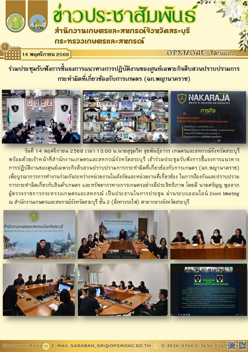 วันที่ 14 พฤศจิกายน 2568 เวลา 13.00 น.นายสุขุมวิท สุขพันธุ์ถาวร เกษตรและสหกรณ์จังหวัดสระบุรี พร้อมด้วยเจ้าหน้าที่สำนักงานเกษตรและสหกรณ์จังหวัดสระบุรี เข้าร่วมประชุมรับฟังการชี้แจงการแนวทาง การปฏิบัติงานของศูนย์เฉพาะกิจสืบสวนปราบปรามการกระทำผิดที่เกี่ยวข้องกับการเกษตร (ฉก.พญานาคราช) เพื่อบูรณาการการทำงานร่วมกันระหว่างหน่วยงานในสังกัดและหน่วยงานที่เกี่ยวข้อง ในการป้องกันและปราบปราม การกระทำผิดเกี่ยวกับสินค้าเกษตร และทรัพยากรทางการเกษตรอย่างมีประสิทธิภาพ โดยมี นายศรัญญู พูลลาภ ผู้ตรวจราชการกระทรวงเกษตรและสหกรณ์ เป็นประธานในการประชุม ผ่านระบบออนไลน์ Zoom Meeting ณ สำนักงานเกษตรและสหกรณ์จังหวัดสระบุรี ชั้น 2 (ฝั่งทางรถไฟ) ศาลากลางจังหวัดสระบุรี