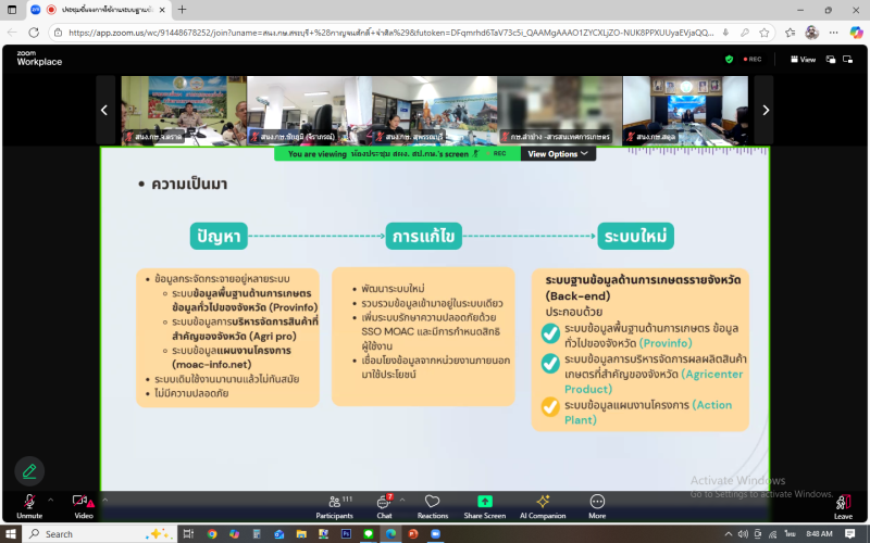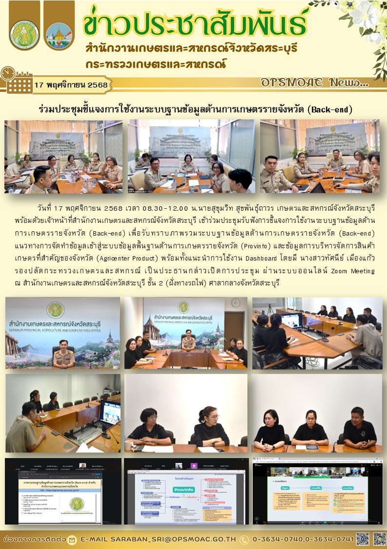 วันที่ 17 พฤศจิกายน 2568 เวลา 08.30-12.00 น.นายสุขุมวิท สุขพันธุ์ถาวร เกษตรและสหกรณ์จังหวัดสระบุรี พร้อมด้วยเจ้าหน้าที่สำนักงานเกษตรและสหกรณ์จังหวัดสระบุรี เข้าร่วมประชุมรับฟังการชี้แจงการใช้งานระบบฐานข้อมูลด้านการเกษตรรายจังหวัด (Back-end) เพื่อรับทราบภาพรวมระบบฐานข้อมูลด้านการเกษตรรายจังหวัด (Back-end) แนวทางการจัดทำข้อมูลเข้าสู่ระบบข้อมูลพื้นฐานด้านการเกษตรรายจังหวัด (Provinfo) และข้อมูลการบริหารจัดการสินค้าเกษตรที่สำคัญของจังหวัด (Agricenter Product) พร้อมทั้งแนะนำการใช้งาน Dashboard โดยมี นางสาวทัศนีย์ เมืองแก้ว รองปลัดกระทรวงเกษตรและสหกรณ์ เป็นประธานกล่าวเปิดการประชุม ผ่านระบบออนไลน์ Zoom Meeting ณ สำนักงานเกษตรและสหกรณ์จังหวัดสระบุรี ชั้น 2 (ฝั่งทางรถไฟ) ศาลากลางจังหวัดสระบุรี