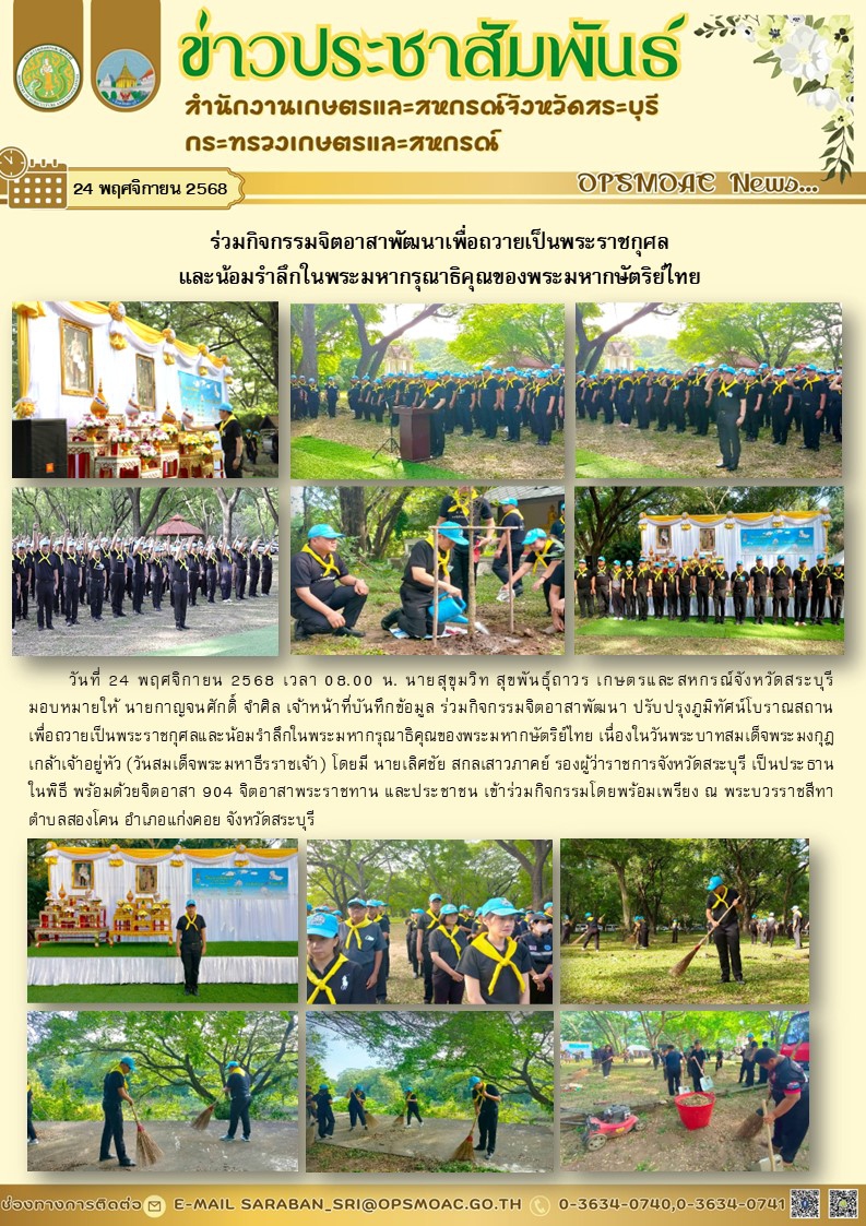 วันที่ 24 พฤศจิกายน 2568 เวลา 08.00 น. นายสุขุมวิท สุขพันธุ์ถาวร เกษตรและสหกรณ์จังหวัดสระบุรี มอบหมายให้ นายกาญจนศักดิ์ จำศิล เจ้าหน้าที่บันทึกข้อมูล ร่วมกิจกรรมจิตอาสาพัฒนา ปรับปรุงภูมิทัศน์โบราณสถาน เพื่อถวายเป็นพระราชกุศลและน้อมรำลึกในพระมหากรุณาธิคุณของพระมหากษัตริย์ไทย เนื่องในวันพระบาทสมเด็จพระมงกุฎเกล้าเจ้าอยู่หัว (วันสมเด็จพระมหาธีรราชเจ้า) โดยมี นายเลิศชัย สกลเสาวภาคย์ รองผู้ว่าราชการจังหวัดสระบุรี เป็นประธานในพิธี พร้อมด้วยจิตอาสา 904 จิตอาสาพระราชทาน และประชาชน เข้าร่วมกิจกรรมโดยพร้อมเพรียง ณ พระบวรราชสีทา ตำบลสองโคน อำเภอแก่งคอย จังหวัดสระบุรี
