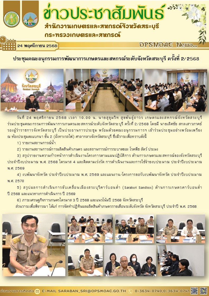 ส่วนวาระเพื่อพิจารณา ได้แก่ การจัดทำปฏิทินผลผลิตสินค้าเกษตรรายเดือนระดับจังหวัด จังหวัดสระบุรี ประจำปี พ.ศ. 2568