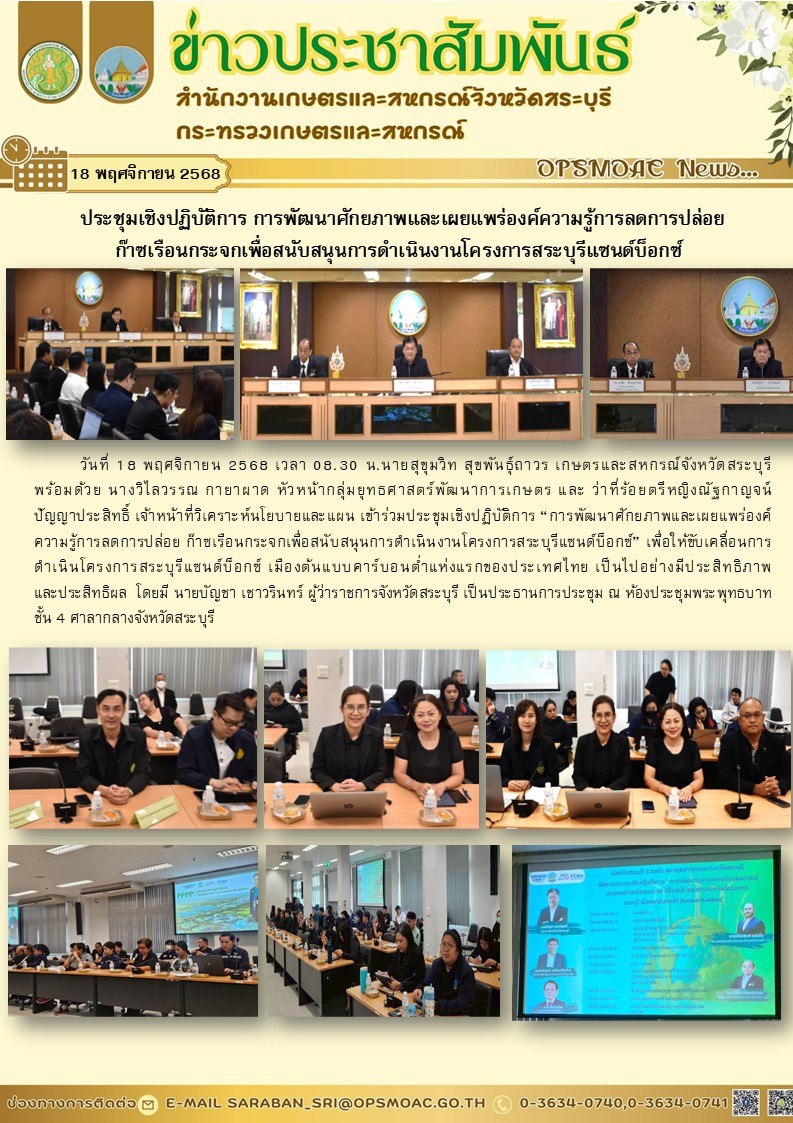 วันที่ 18 พฤศจิกายน 2568 เวลา 08.30 น.นายสุขุมวิท สุขพันธุ์ถาวร เกษตรและสหกรณ์จังหวัดสระบุรีพร้อมด้วย นางวิไลวรรณ กายาผาด หัวหน้ากลุ่มยุทธศาสตร์พัฒนาการเกษตร และ ว่าที่ร้อยตรีหญิงณัฐกาญจน์ ปัญญาประสิทธิ์ เจ้าหน้าที่วิเคราะห์นโยบายและแผน เข้าร่วมประชุมเชิงปฏิบัติการ “การพัฒนาศักยภาพและเผยแพร่องค์ความรู้การลดการปล่อย ก๊าซเรือนกระจกเพื่อสนับสนุนการดำเนินงานโครงการสระบุรีแซนด์บ็อกซ์” เพื่อให้ขับเคลื่อนการดำเนินโครงการสระบุรีแซนด์บ็อกซ์ เมืองต้นแบบคาร์บอนต่ำแห่งแรกของประเทศไทย เป็นไปอย่างมีประสิทธิภาพ และประสิทธิผล โดยมี นายบัญชา เชาวรินทร์ ผู้ว่าราชการจังหวัดสระบุรี เป็นประธานการประชุม ณ ห้องประชุมพระพุทธบาท ชั้น 4 ศาลากลางจังหวัดสระบุรี
