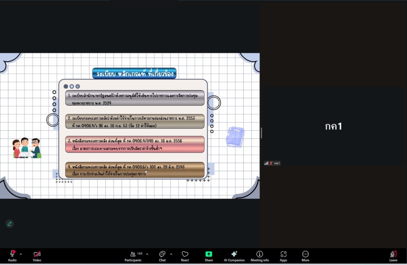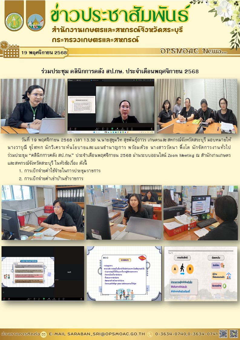 วันที่ 19 พฤศจิกายน 2568 เวลา 13.30 น.นายสุขุมวิท สุขพันธุ์ถาวร เกษตรและสหกรณ์จังหวัดสระบุรี มอบหมายให้ นางวารุณี จุโฬทก นักวิเคราะห์นโยบายและแผนชำนาญการ พร้อมด้วย นางสาวรัตนา พึ่งโต นักจัดการงานทั่วไป ร่วมประชุม “คลินิกการคลัง สป.กษ.” ประจำเดือนพฤศจิกายน 2568 ผ่านระบบออนไลน์ Zoom Meeting ณ สำนักงานเกษตร และสหกรณ์จังหวัดสระบุรี ในหัวข้อเรื่อง ดังนี้