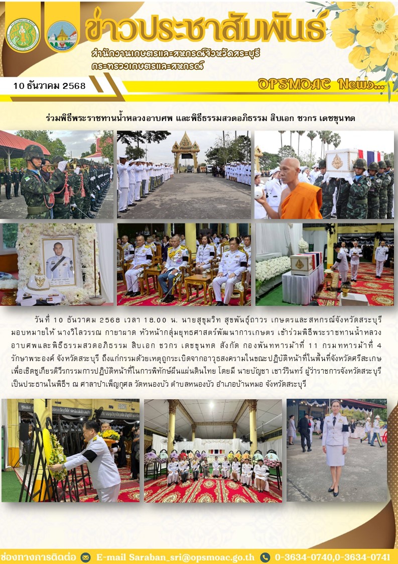 วันที่ 10 ธันวาคม 2568 เวลา 18.00 น. นายสุขุมวิท สุขพันธุ์ถาวร เกษตรและสหกรณ์จังหวัดสระบุรี มอบหมายให้ นางวิไลวรรณ กายาผาด หัวหน้ากลุ่มยุทธศาสตร์พัฒนาการเกษตร เข้าร่วมพิธีพระราชทานน้ำหลวงอาบศพและพิธีธรรมสวดอภิธรรม สิบเอก ชวกร เดชขุนทด สังกัด กองพันทหารม้าที่ 11 กรมทหารม้าที่ 4 รักษาพระองค์ จังหวัดสระบุรี ถึงแก่กรรมด้วยเหตุถูกระเบิดจากอาวุธสงครามในขณะปฏิบัติหน้าที่ในพื้นที่จังหวัดศรีสะเกษ เพื่อเชิดชูเกียรติวีรกรรมการปฏิบัติหน้าที่ในการพิทักษ์ผืนแผ่นดินไทย โดยมี นายบัญชา เชาว์รินทร์ ผู้ว่าราชการจังหวัดสระบุรี เป็นประธานในพิธีฯ ณ ศาลาบำเพ็ญกุศล วัดหนองบัว ตำบลหนองบัว อำเภอบ้านหมอ จังหวัดสระบุรี
