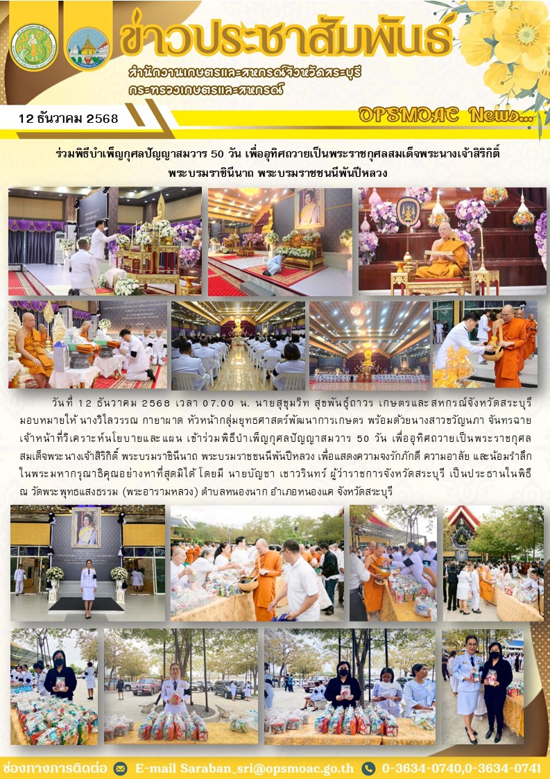 วันที่ 12 ธันวาคม 2568 เวลา 07.00 น. นายสุขุมวิท สุขพันธุ์ถาวร เกษตรและสหกรณ์จังหวัดสระบุรี มอบหมายให้ นางวิไลวรรณ กายาผาด หัวหน้ากลุ่มยุทธศาสตร์พัฒนาการเกษตร พร้อมด้วยนางสาวขวัญนภา จันทรฉาย เจ้าหน้าที่วิเคราะห์นโยบายและแผน เข้าร่วมพิธีบำเพ็ญกุศลปัญญาสมวาร 50 วัน เพื่ออุทิศถวายเป็นพระราชกุศล สมเด็จพระนางเจ้าสิริกิติ์ พระบรมราชินีนาถ พระบรมราชชนนีพันปีหลวง เพื่อแสดงความจงรักภักดี ความอาลัย และน้อมรำลึก ในพระมหากรุณาธิคุณอย่างหาที่สุดมิได้ โดยมี นายบัญชา เชาวรินทร์ ผู้ว่าราชการจังหวัดสระบุรี เป็นประธานในพิธี
