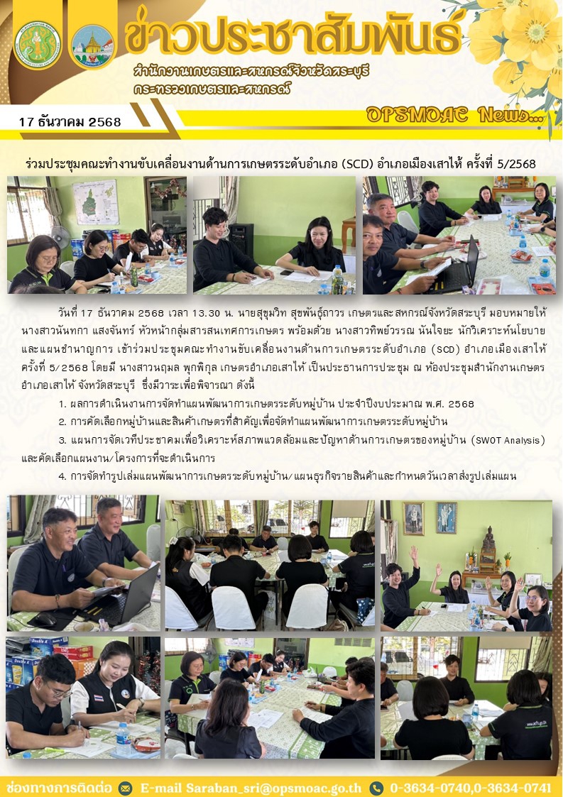 วันที่ 17 ธันวาคม 2568 เวลา 13.30 น. นายสุขุมวิท สุขพันธุ์ถาวร เกษตรและสหกรณ์จังหวัดสระบุรี มอบหมายให้ นางสาวนันทกา แสงจันทร์ หัวหน้ากลุ่มสารสนเทศการเกษตร พร้อมด้วย นางสาวทิพย์วรรณ นันใจยะ นักวิเคราะห์นโยบายและแผนชำนาญการ เข้าร่วมประชุมคณะทำงานขับเคลื่อนงานด้านการเกษตรระดับอำเภอ (SCD) อำเภอเมืองเสาไห้ ครั้งที่ 5/2568 โดยมี นางสาวนฤมล พุกพิกุล เกษตรอำเภอเสาไห้ เป็นประธานการประชุม ณ ห้องประชุมสำนักงานเกษตรอำเภอเสาไห้ จังหวัดสระบุรี ซึ่งมีวาระเพื่อพิจารณา ดังนี้