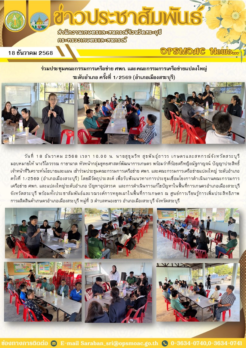 วันที่ 18 ธันวาคม 2568 เวลา 10.00 น. นายสุขุมวิท สุขพันธุ์ถาวร เกษตรและสหกรณ์จังหวัดสระบุรี มอบหมายให้ นางวิไลวรรณ กายาผาด หัวหน้ากลุ่มยุทธศาสตร์พัฒนาการเกษตร พร้อมว่าที่ร้อยตรีหญิงณัฐกาญจน์ ปัญญาประสิทธิ์ เจ้าหน้าที่วิเคราะห์นโยบายและแผน เข้าร่วมประชุมคณะกรรมการเครือข่าย ศพก. และคณะกรรมการเครือข่ายแปลงใหญ่ ระดับอำเภอ ครั้งที่ 1/2569 (อำเภอเมืองสระบุรี) โดยมีวัตถุประสงค์ เพื่อรับฟังแนวทางการประชุมเชื่อมโยงการดำเนินงานคณะกรรมการเครือข่าย ศพก. และแปลงใหญ่ระดับอำเภอ ปัญหาอุปสรรค และการดำเนินการแก้ไขปัญหาในพื้นที่การเกษตรอำเภอเมืองสระบุรี จังหวัดสระบุรี พร้อมทั้งประชาสัมพันธ์และรณรงค์การหยุดเผาในพื้นที่การเกษตร ณ ศูนย์การเรียนรู้การเพิ่มประสิทธิภาพ การผลิตสินค้าเกษตรอำเภอเมืองสระบุรี หมู่ที่ 3 ตำบลหนองยาว อำเภอเมืองสระบุรี จังหวัดสระบุรี
