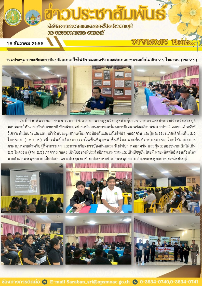 วันที่ 18 ธันวาคม 2568 เวลา 14.30 น. นายสุขุมวิท สุขพันธุ์ถาวร เกษตรและสหกรณ์จังหวัดสระบุรี มอบหมายให้ นายวรวิทย์ ฉายะรถี หัวหน้ากลุ่มช่วยเหลือเกษตรกรและโครงการพิเศษ พร้อมด้วย นางสาวปราณี จอหอ เจ้าหน้าที่วิเคราะห์นโยบายและแผน เข้าร่วมประชุมการเตรียมการป้องกันและแก้ไขไฟป่า หมอกควัน และฝุ่นละอองขนาดเล็กไม่เกิน 2.5 ไมครอน (PM 2.5) เพื่อเน้นย้ำเรื่องการเผาในพื้นที่ชุมชน พื้นที่โล่ง และพื้นที่เกษตรกรรม โดยใช้มาตรการ ตามกฏหมายสำหรับผู้ที่ทำการเผา และการเตรียมการป้องกันและแก้ไขไฟป่า หมอกควัน และฝุ่นละอองขนาดเล็กไม่เกิน 2.5 ไมครอน (PM 2.5) ภาคการเกษตร เป็นไปอย่างมีประสิทธิภาพเหมาะสมและเป็นปัจจุบัน โดยมี นายมนัสพันธ์ ดอนก้อนไพร นายอำเภอพระพุทธบาท เป็นประธานการประชุม ณ ศาลาประชาคมอำเภอพระพุทธบาท อำเภอพระพุทธบาท จังหวัดสระบุรี