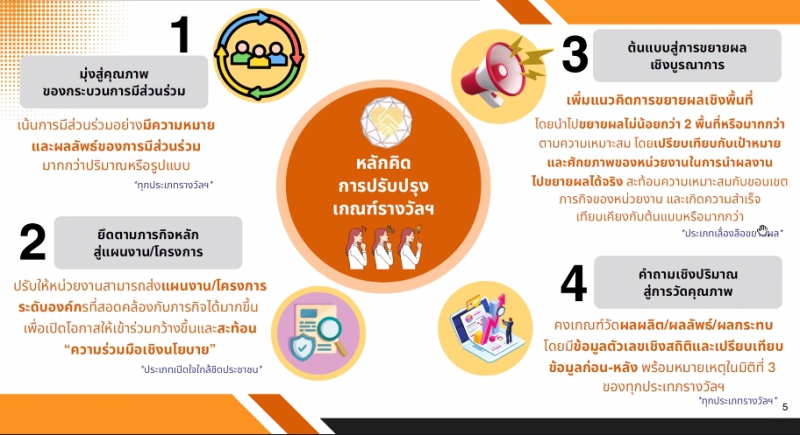 วันที่ 18 ธันวาคม 2568 เวลา 13.30 น. นายสุขุมวิท สุขพันธุ์ถาวร เกษตรและสหกรณ์จังหวัดสระบุรี มอบหมายให้ นางวิไลวรรณ กายาผาด หัวหน้ากลุ่มยุทธศาสตร์พัฒนาการเกษตร พร้อมด้วย นางสาวสุภิญญา บุญช่วย นักวิเคราะห์นโยบายและแผนชำนาญการ เข้าร่วมการประชุมชี้แจงการเขียนผลงานเพื่อสมัครรางวัลเลิศรัฐ สาขารางวัล การบริหารราชการแบบมีส่วนร่วม ประเภทรางวัลสัมฤทธิผลประชาชนมีส่วนร่วม Effectiveness of People Participation ของสำนักงานปลัดกระทรวงเกษตและสหกรณ์ ประจำปี พ.ศ. 2569 ผ่านระบบอิเล็กทรอนิกส์ Zoom Meeting โดยมี นางสาวรัตนา เสาวนียากร ผู้อำนวยการสำนักพัฒนาระบบบริหาร เป็นประธานการประชุม