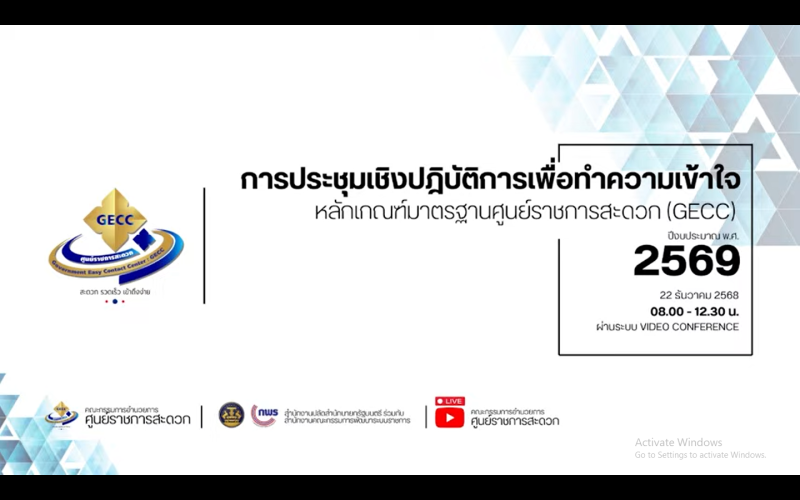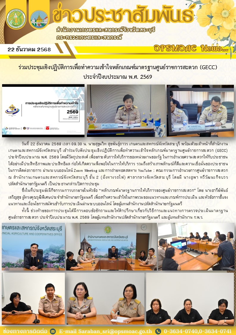 วันที่ 22 ธันวาคม 2568 เวลา 09.30 น. นายสุขุมวิท สุขพันธุ์ถาวร เกษตรและสหกรณ์จังหวัดสระบุรี พร้อมด้วยเจ้าหน้าที่สำนักงานเกษตรและสหกรณ์จังหวัดสระบุรี เข้าร่วมรับฟังประชุมเชิงปฏิบัติการเพื่อทำความเข้าใจหลักเกณฑ์มาตรฐานศูนย์ราชการสะดวก (GECC) ประจำปีงบประมาณ พ.ศ. 2569 โดยมีวัตถุประสงค์ เพื่อยกระดับการให้บริการของหน่วยงานของรัฐ ในการอำนวยความสะดวกให้กับประชาชนได้อย่างมีประสิทธิภาพและประสิทธิผล ก่อให้เกิดความพึงพอใจในการให้บริการ รวมถึงสร้างภาพลักษณ์ที่ดีและความเชื่อมั่นของประชาชน ในการติดต่อราชการ ผ่านระบบออนไลน์ Zoom Meeting และการถ่ายทอดสดทาง YouTube : คณะกรรมการอำนวยการศูนย์ราชการสะดวก ณ สำนักงานเกษตรและสหกรณ์จังหวัดสระบุรี ชั้น 2 (ฝั่งทางรถไฟ) ศาลากลางจังหวัดสระบุรี โดยมี นางอุพา ทวีวัฒนะกิจบวร ปลัดสำนักนายกรัฐมนตรี เป็นประธานกล่าวเปิดการประชุม