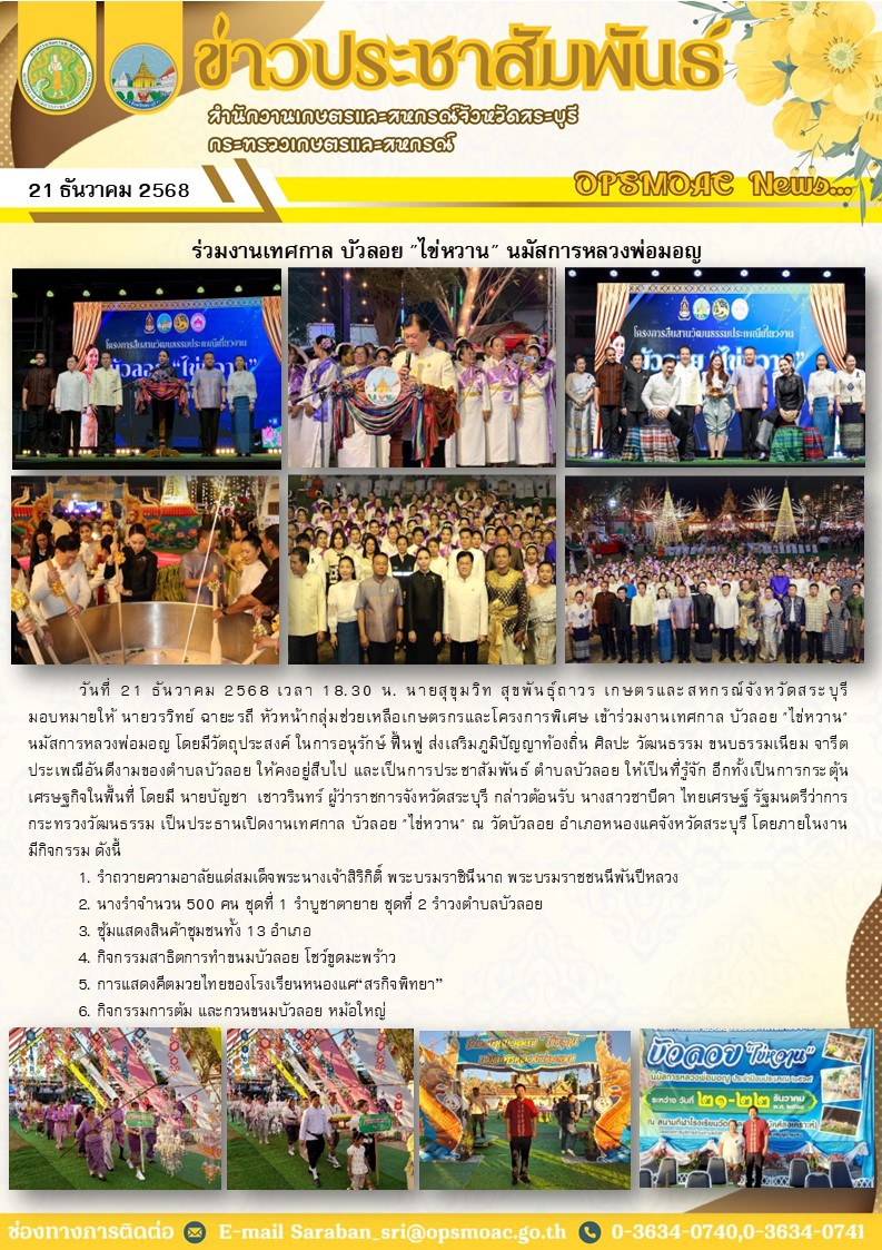 วันที่ 21 ธันวาคม 2568 เวลา 18.30 น. นายสุขุมวิท สุขพันธุ์ถาวร เกษตรและสหกรณ์จังหวัดสระบุรี มอบหมายให้ นายวรวิทย์ ฉายะรถี หัวหน้ากลุ่มช่วยเหลือเกษตรกรและโครงการพิเศษ เข้าร่วมงานเทศกาล บัวลอย "ไข่หวาน" นมัสการหลวงพ่อมอญ โดยมีวัตถุประสงค์ ในการอนุรักษ์ ฟื้นฟู ส่งเสริมภูมิปัญญาท้องถิ่น ศิลปะ วัฒนธรรม ขนบธรรมเนียม จารีตประเพณีอันดีงามของตำบลบัวลอย ให้คงอยู่สืบไป และเป็นการประชาสัมพันธ์ ตำบลบัวลอย ให้เป็นที่รู้จัก อีกทั้งเป็นการกระตุ้นเศรษฐกิจในพื้นที่ โดยมี นายบัญชา เชาวรินทร์ ผู้ว่าราชการจังหวัดสระบุรี กล่าวต้อนรับ นางสาวซาบีดา ไทยเศรษฐ์ รัฐมนตรีว่าการกระทรวงวัฒนธรรม เป็นประธานเปิดงานเทศกาล บัวลอย "ไข่หวาน" ณ วัดบัวลอย อำเภอหนองแคจังหวัดสระบุรี โดยภายในงาน มีกิจกรรม ดังนี้
