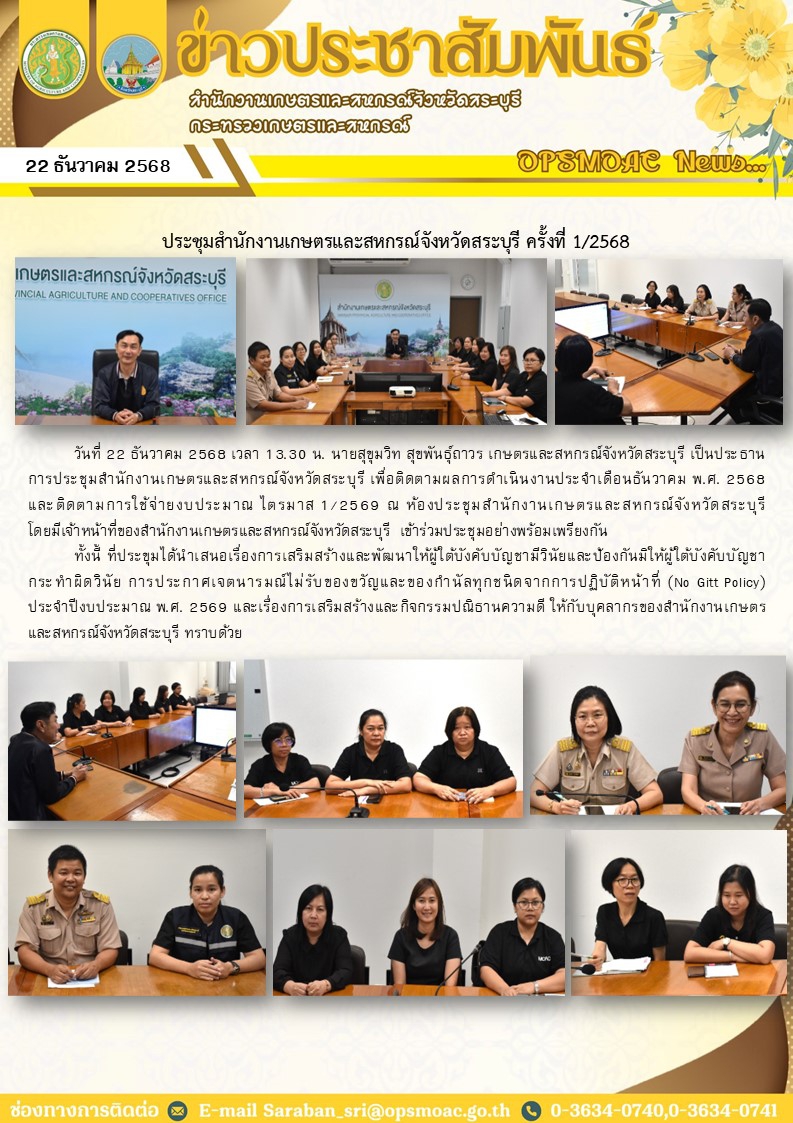 วันที่ 22 ธันวาคม 2568 เวลา 13.30 น. นายสุขุมวิท สุขพันธุ์ถาวร เกษตรและสหกรณ์จังหวัดสระบุรี เป็นประธาน การประชุมสำนักงานเกษตรและสหกรณ์จังหวัดสระบุรี เพื่อติดตามผลการดำเนินงานประจำเดือนธันวาคม พ.ศ. 2568 และติดตามการใช้จ่ายงบประมาณ ไตรมาส 1/2569 ณ ห้องประชุมสำนักงานเกษตรและสหกรณ์จังหวัดสระบุรี โดยมีเจ้าหน้าที่ของสำนักงานเกษตรและสหกรณ์จังหวัดสระบุรี เข้าร่วมประชุมอย่างพร้อมเพรียงกัน
