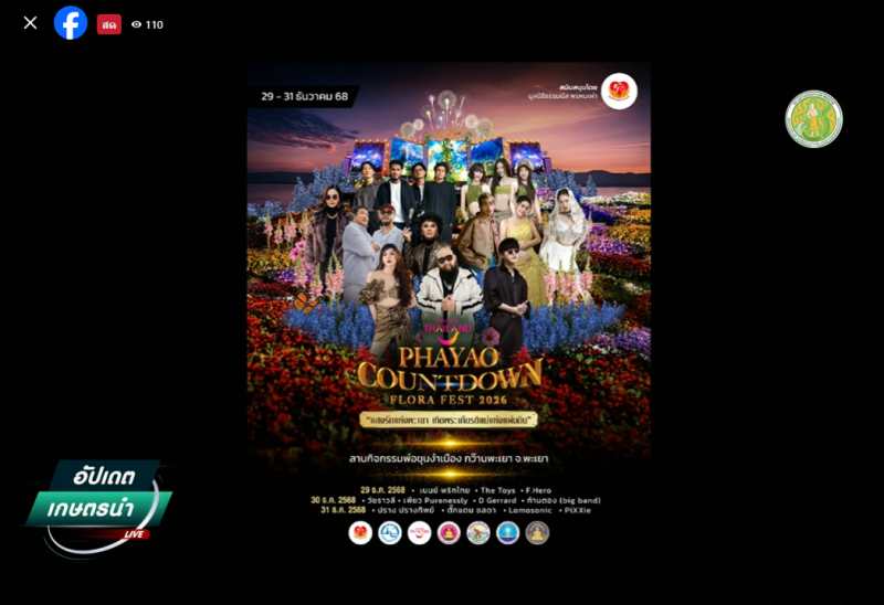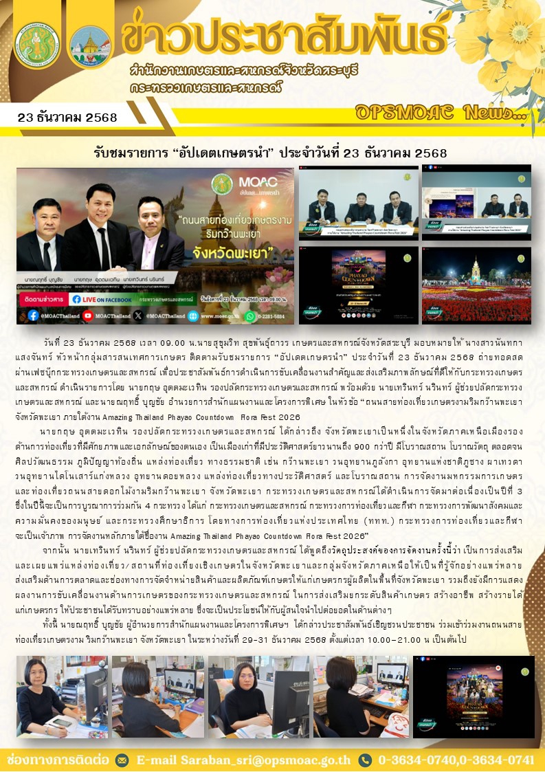 วันที่ 23 ธันวาคม 2568 เวลา 09.00 น.นายสุขุมวิท สุขพันธุ์ถาวร เกษตรและสหกรณ์จังหวัดสระบุรี มอบหมายให้ นางสาวนันทกา แสงจันทร์ หัวหน้ากลุ่มสารสนเทศการเกษตร ติดตามรับชมรายการ “อัปเดตเกษตรนำ” ประจำวันที่ 23 ธันวาคม 2568 ถ่ายทอดสด ผ่านเฟซบุ๊กกระทรวงเกษตรและสหกรณ์ เพื่อประชาสัมพันธ์การดำเนินการขับเคลื่อนงานสำคัญและส่งเสริมภาพลักษณ์ที่ดีให้กับกระทรวงเกษตรและสหกรณ์ ดำเนินรายการโดย นายกฤษ อุตตมะเวทิน รองปลัดกระทรวงเกษตรและสหกรณ์ พร้อมด้วย นายเทวินทร์ นรินทร์ ผู้ช่วยปลัดกระทรวงเกษตรและสหกรณ์ และนายณฤทธิ์ บุญชัย อำนวยการสำนักแผนงานและโครงการพิเศษ ในหัวข้อ “ถนนสายท่องเที่ยวเกษตรงามริมกว๊านพะเยา จังหวัดพะเยา ภายใต้งาน Amazing Thailand Phayao Countdown Flora Fest 2026