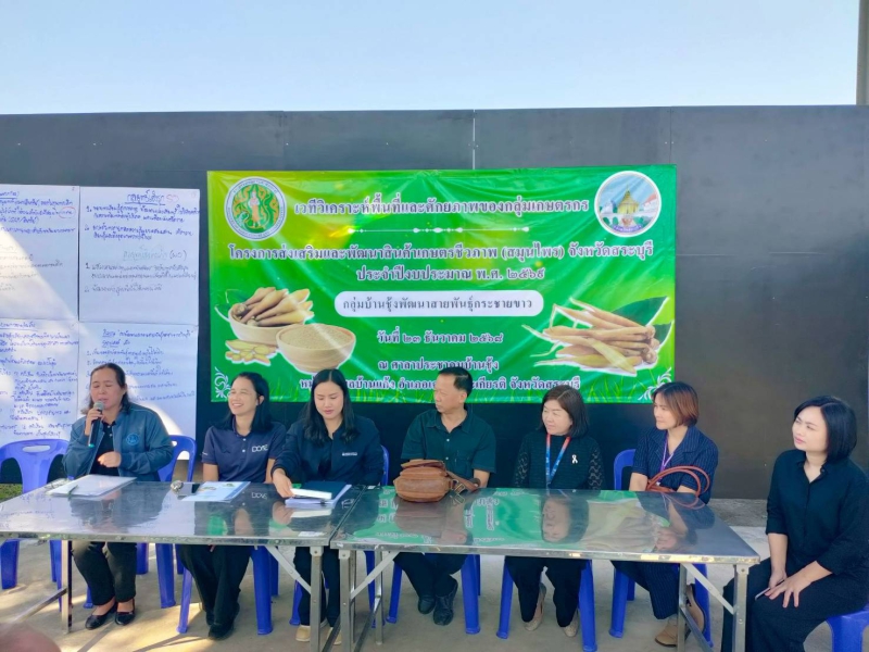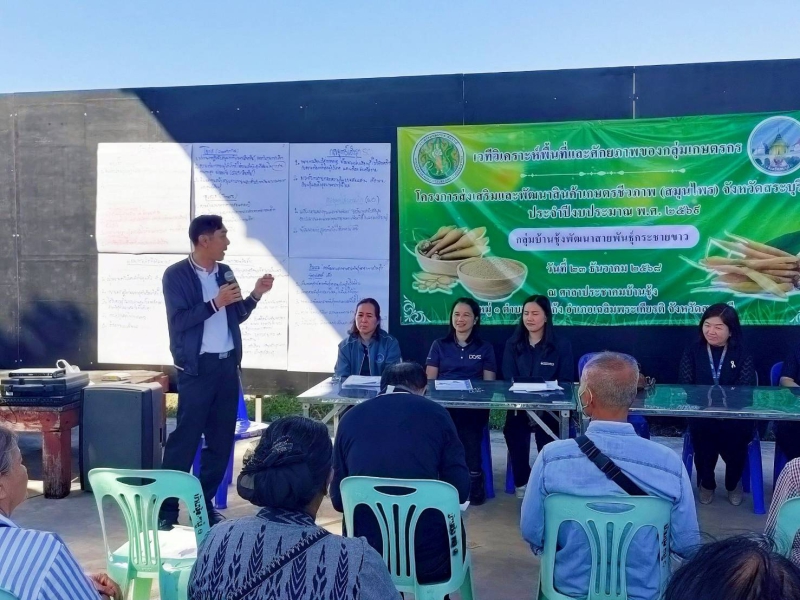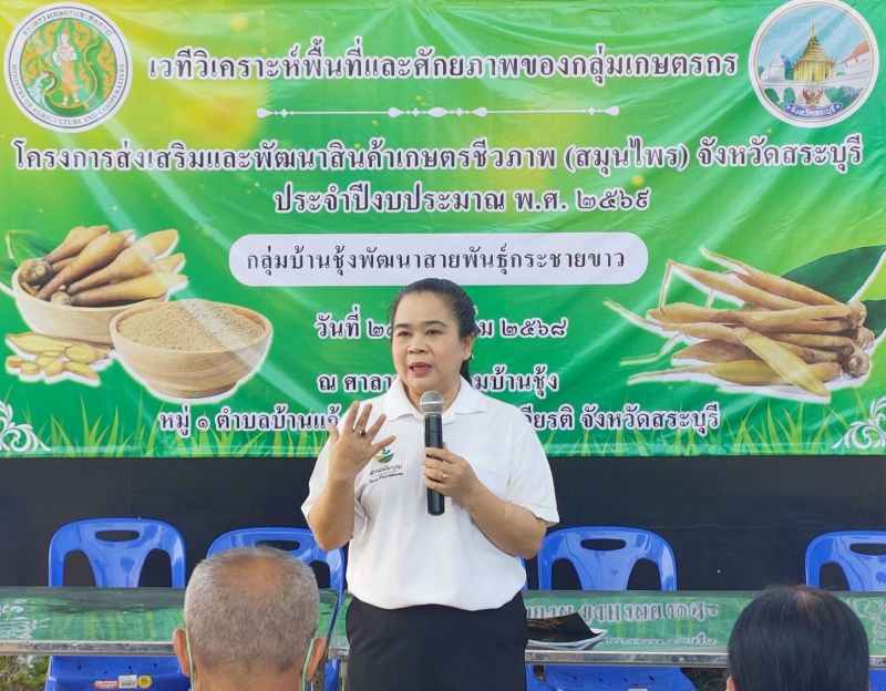 วันที่ 23 ธันวาคม 2568 เวลา 09.30 น. นายสุขุมวิท สุขพันธุ์ถาวร เกษตรและสหกรณ์จังหวัดสระบุรี เป็นประธาน เปิดการจัดเวทีวิเคราะห์พื้นที่และศักยภาพของกลุ่มเกษตรกร ภายใต้โครงการส่งเสริมและพัฒนา สินค้าเกษตรชีวภาพ (สมุนไพร) ประจำปีงบประมาณ พ.ศ. 2569 เพื่อกำหนดแนวทางการขับเคลื่อนงานของกลุ่มให้สามารถผลิตพืช สมุนไพรที่มีคุณภาพเข้าสู่มาตรฐาน GAP หรือมาตรฐานเกษตรอินทรีย์ และมีวิธีการผลิตสมุนไพรให้ได้สารสำคัญ ณ ศาลาประชาคมบ้านซุ้ง หมู่ที่ 1 ตำบลบ้านแก้ง อำเภอเฉลิมพระเกียรติ จังหวัดสระบุรี