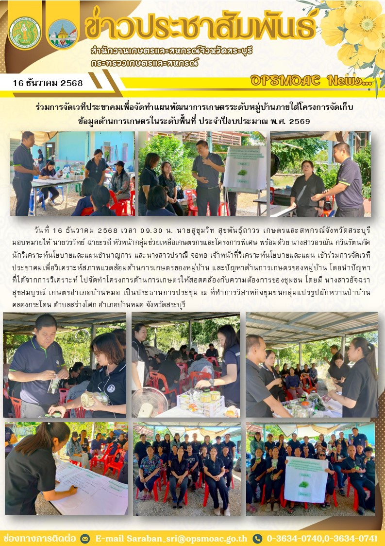 วันที่ 16 ธันวาคม 2568 เวลา 09.30 น. นายสุขุมวิท สุขพันธุ์ถาวร เกษตรและสหกรณ์จังหวัดสระบุรี มอบหมายให้ นายวรวิทย์ ฉายะรถี หัวหน้ากลุ่มช่วยเหลือเกษตรกรและโครงการพิเศษ พร้อมด้วย นางสาวอรณัน กวินรัตนภัค นักวิเคราะห์นโยบายและแผนชำนาญการ และนางสาวปราณี จอหอ เจ้าหน้าที่วิเคราะห์นโยบายและแผน เข้าร่วมการจัดเวทีประชาคมเพื่อวิเคราะห์สภาพแวดล้อมด้านการเกษตรของหมู่บ้าน และปัญหาด้านการเกษตรของหมู่บ้าน โดยนำปัญหาที่ได้จากการวิเคราะห์ ไปจัดทำโครงการด้านการเกษตรให้สอดคล้องกับความต้องการของชุมชน โดยมี นางสาวอัจฉรา สุขสมบูรณ์ เกษตรอำเภอบ้านหมอ เป็นประธานการประชุม ณ ที่ทำการวิสาหกิจชุมชนกลุ่มแปรรูปผักหวานป่าบ้านคลองกระโดน ตำบลสร่างโศก อำเภอบ้านหมอ จังหวัดสระบุรี