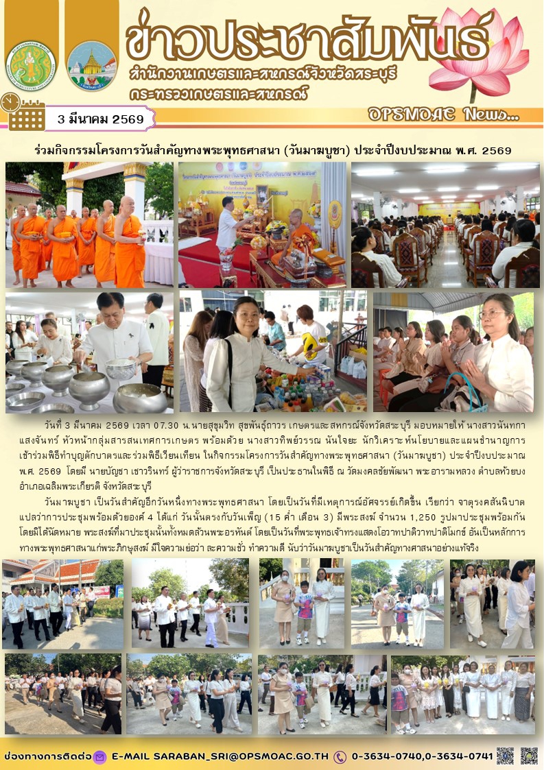 วันที่ 3 มีนาคม 2569 เวลา 07.30 น.นายสุขุมวิท สุขพันธุ์ถาวร เกษตรและสหกรณ์จังหวัดสระบุรี มอบหมายให้ นางสาวนันทกา แสงจันทร์ หัวหน้ากลุ่มสารสนเทศการเกษตร พร้อมด้วย นางสาวทิพย์วรรณ นันใจยะ นักวิเคราะห์นโยบายและแผนชำนาญการ เช้าร่วมพิธีทำบุญตักบาตรและร่วมพิธีเวียนเทียน ในกิจกรรมโครงการวันสำคัญทางพระพุทธศาสนา (วันมาฆบูชา) ประจำปีงบประมาณ พ.ศ. 2569 โดยมี นายบัญชา เชาวรินทร์ ผู้ว่าราชการจังหวัดสระบุรี เป็นประธานในพิธี ณ วัดมงคลชัยพัฒนา พระอารามหลวง ตำบลห้วยบง อำเภอเฉลิมพระเกียรติ จังหวัดสระบุรี