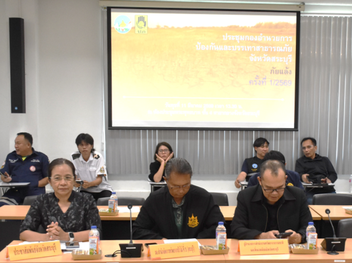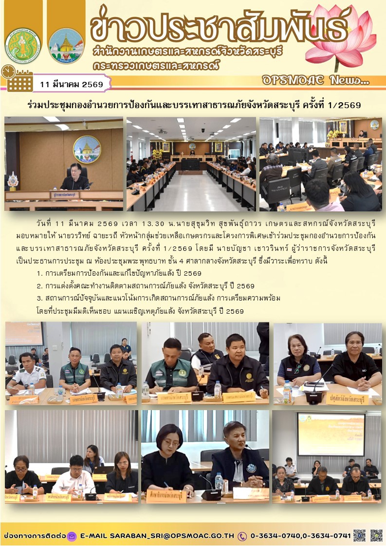 วันที่ 11 มีนาคม 2569 เวลา 13.30 น.นายสุขุมวิท สุขพันธุ์ถาวร เกษตรและสหกรณ์จังหวัดสระบุรี มอบหมายให้ นายวรวิทย์ ฉายะรถี หัวหน้ากลุ่มช่วยเหลือเกษตรกรและโครงการพิเศษเข้าร่วมประชุมกองอํานวยการป้องกันและบรรเทาสาธารณภัยจังหวัดสระบุรี ครั้งที่ 1/2569 โดยมี นายบัญชา เชาวรินทร์ ผู้ว่าราชการจังหวัดสระบุรี เป็นประธานการประชุม ณ ห้องประชุมพระพุทธบาท ชั้น 4 ศาลากลางจังหวัดสระบุรี ซึ่งมีวาระเพื่อทราบ ดังนี้