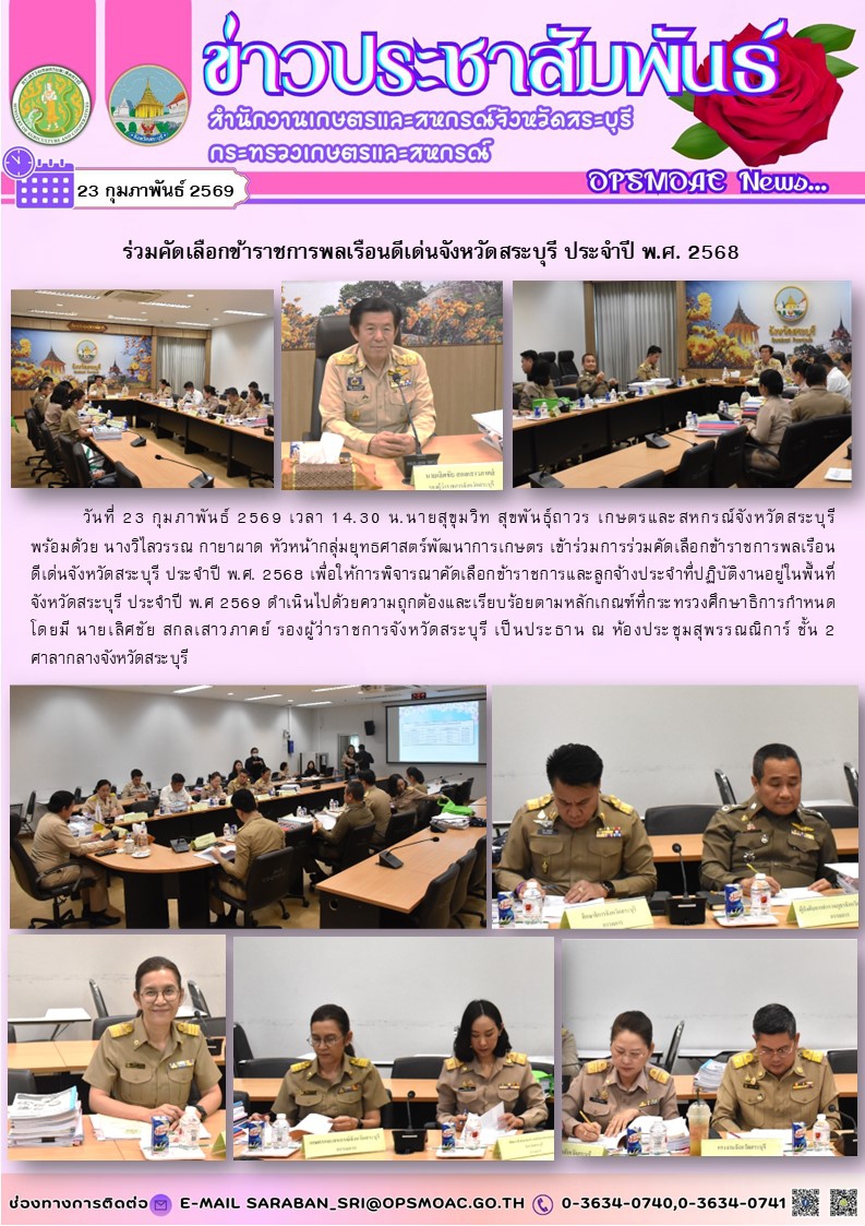 วันที่ 23 กุมภาพันธ์ 2569 เวลา 14.30 น.นายสุขุมวิท สุขพันธุ์ถาวร เกษตรและสหกรณ์จังหวัดสระบุรี พร้อมด้วย นางวิไลวรรณ กายาผาด หัวหน้ากลุ่มยุทธศาสตร์พัฒนาการเกษตร เข้าร่วมการร่วมคัดเลือกข้าราชการพลเรือนดีเด่นจังหวัดสระบุรี ประจำปี พ.ศ. 2568 เพื่อให้การพิจารณาคัดเลือกข้าราชการและลูกจ้างประจำที่ปฏิบัติงานอยู่ในพื้นที่ จังหวัดสระบุรี ประจำปี พ.ศ 2569 ดำเนินไปด้วยความถุกต้องและเรียบร้อยตามหลักเกณฑ์ที่กระทรวงศึกษาธิการกำหนด โดยมี นายเลิศชัย สกลเสาวภาคย์ รองผู้ว่าราชการจังหวัดสระบุรี เป็นประธาน ณ ห้องประชุมสุพรรณณิการ์ ชั้น 2 ศาลากลางจังหวัดสระบุรี