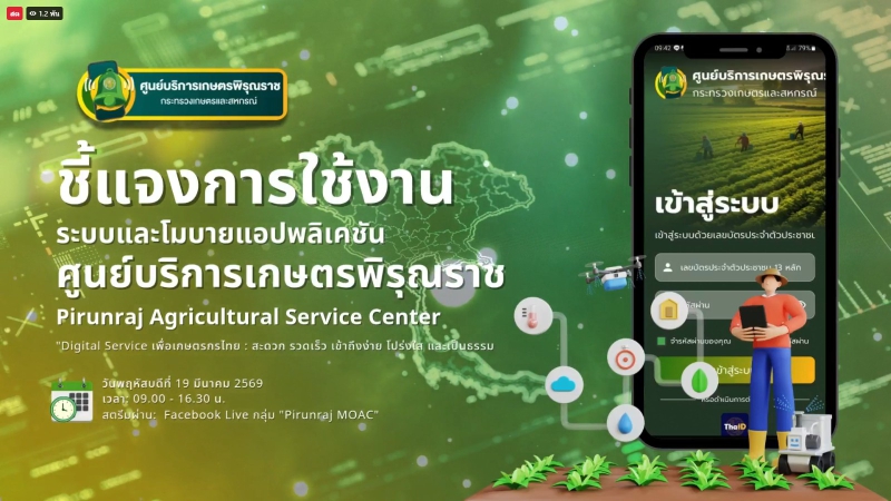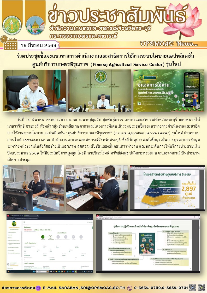 วันที่ 19 มีนาคม 2569 เวลา 09.30 น.นายสุขุมวิท สุขพันธุ์ถาวร เกษตรและสหกรณ์จังหวัดสระบุรี มอบหมายให้ นายวรวิทย์ ฉายะรถี หัวหน้ากลุ่มช่วยเหลือเกษตรกรและโครงการพิเศษเข้าร่วมประชุมชี้แจงแนวทางการดำเนินงานและสาธิตการใช้งานระบบโมบาย แอปพลิเคชั่น “ศูนย์บริการเกษตรพิรุณราช” (Pirunraj Agriculturl Service Center) รุ่นใหม่ ผ่านระบบออนไลน์ Facebook Live ณ สำนักงานเกษตรและสหกรณ์จังหวัดสระบุรี ซึ่งมีวัตถุประสงค์เพื่อมุ่งเน้นการบูรณาการข้อมูลระหว่างหน่วยงานในสังกัดอย่างเป็นเอกภาพ ลดความซับซ้อนของขั้นตอนการทำงาน และยกระดับการให้บริการประชาชนในปีงบประมาณ 2569 ให้มีประสิทธิภาพสูงสุด โดยมี นายวิณะโรจน์ ทรัพย์ส่งสุข ปลัดกระทรวงเกษตรและสหกรณ์เป็นประธานเปิดการประชุม