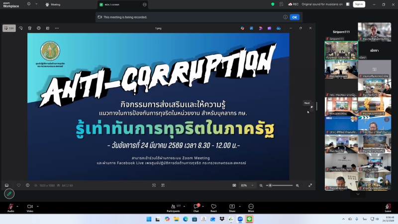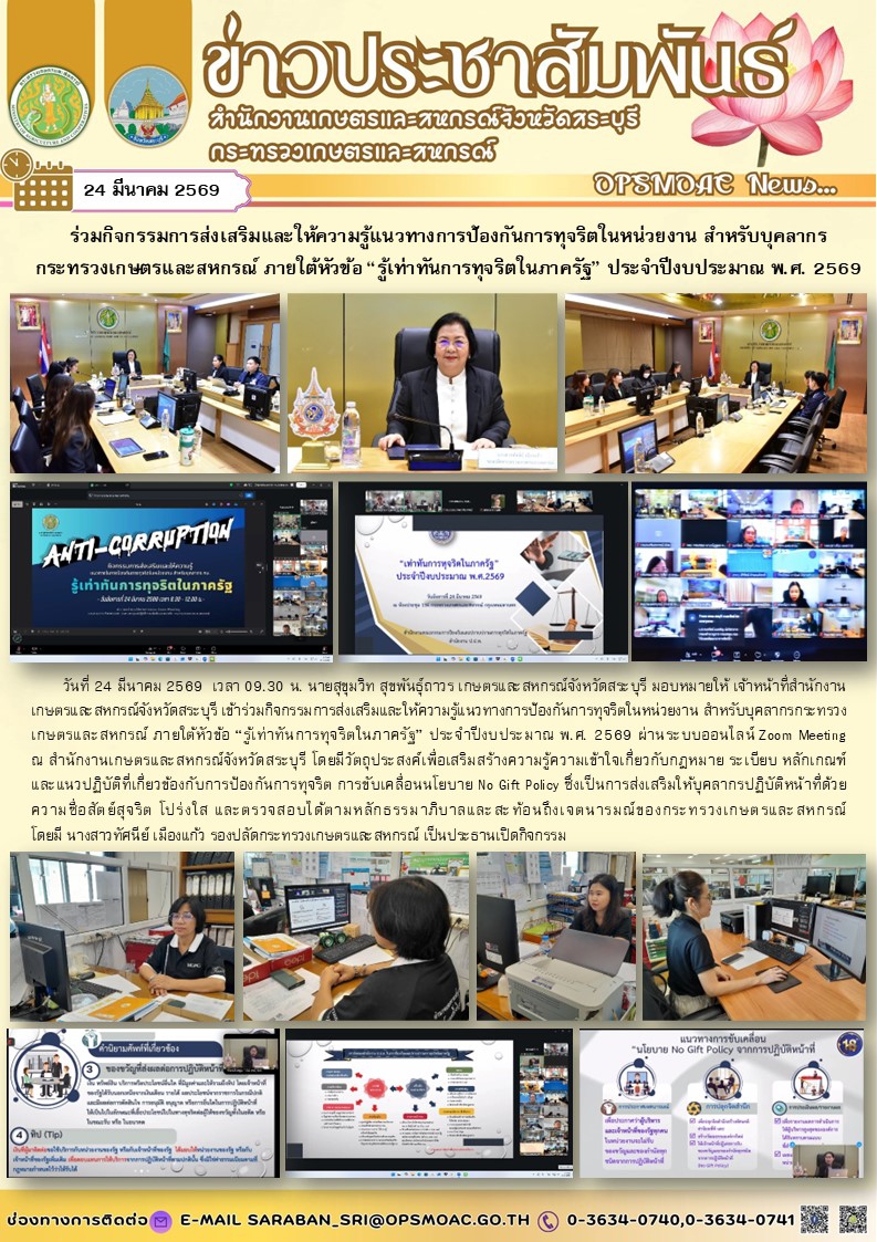 วันที่ 24 มีนาคม 2569 เวลา 09.30 น. นายสุขุมวิท สุขพันธุ์ถาวร เกษตรและสหกรณ์จังหวัดสระบุรี มอบหมายให้ เจ้าหน้าที่สำนักงานเกษตรและสหกรณ์จังหวัดสระบุรี เข้าร่วมกิจกรรมการส่งเสริมและให้ความรู้แนวทางการป้องกันการทุจริตในหน่วยงาน สำหรับบุคลากรกระทรวงเกษตรและสหกรณ์ ภายใต้หัวข้อ “รู้เท่าทันการทุจริตในภาครัฐ” ประจำปีงบประมาณ พ.ศ. 2569 ผ่านระบบออนไลน์ Zoom Meeting ณ สำนักงานเกษตรและสหกรณ์จังหวัดสระบุรี โดยมีวัตถุประสงค์เพื่อเสริมสร้างความรู้ความเข้าใจเกี่ยวกับกฎหมาย ระเบียบ หลักเกณฑ์ และแนวปฏิบัติที่เกี่ยวข้องกับการป้องกันการทุจริต การขับเคลื่อนนโยบาย No Gift Policy ซึ่งเป็นการส่งเสริมให้บุคลากรปฏิบัติหน้าที่ด้วยความซื่อสัตย์สุจริต โปร่งใส และตรวจสอบได้ตามหลักธรรมาภิบาลและสะท้อนถึงเจตนารมณ์ของกระทรวงเกษตรและสหกรณ์ โดยมี นางสาวทัศนีย์ เมืองแก้ว รองปลัดกระทรวงเกษตรและสหกรณ์ เป็นประธานเปิดกิจกรรม