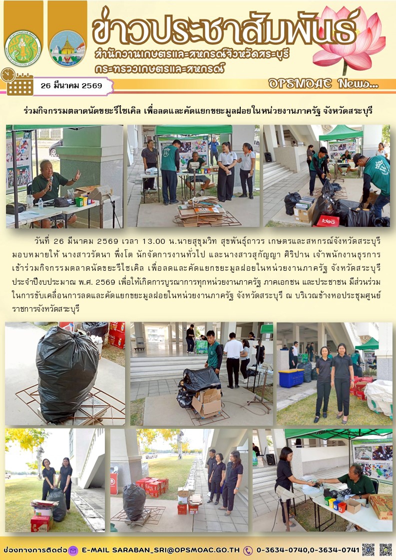 วันที่ 26 มีนาคม 2569 เวลา 13.00 น.นายสุขุมวิท สุขพันธุ์ถาวร เกษตรและสหกรณ์จังหวัดสระบุรี มอบหมายให้ นางสาวรัตนา พึ่งโต นักจัดการงานทั่วไป และนางสาวสุกัญญา ศิริปาน เจ้าพนักงานธุรการเข้าร่วมกิจกรรมตลาดนัดขยะรีไซเคิล เพื่อลดและคัดแยกขยะมูลฝอยในหน่วยงานภาครัฐ จังหวัดสระบุรี ประจำปีงบประมาณ พ.ศ. 2569 เพื่อให้เกิดการบูรณาการทุกหน่วยงานภาครัฐ ภาคเอกชน และประชาชน มีส่วนร่วมในการขับเคลื่อนการลดและคัดแยกขยะมูลฝอยในหน่วยงานภาครัฐ จังหวัดสระบุรี ณ บริเวณข้างหอประชุมศูนย์ราชการจังหวัดสระบุรี