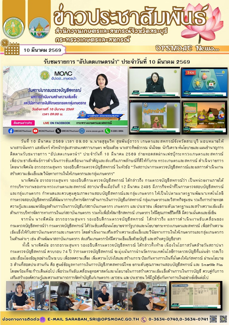 วันที่ 10 มีนาคม 2569 เวลา 09.00 น.นายสุขุมวิท สุขพันธุ์ถาวร เกษตรและสหกรณ์จังหวัดสระบุรี มอบหมายให้ นางสาวนันทกา แสงจันทร์ หัวหน้ากลุ่มสารสนเทศการเกษตร พร้อมด้วย นางสาวทิพย์วรรณ นันใจยะ นักวิเคราะห์นโยบายและแผนชำนาญการ ติดตามรับชมรายการ “อัปเดตเกษตรนำ” ประจำวันที่ 10 มีนาคม 2569 ถ่ายทอดสดผ่านเฟซบุ๊กระทรวงเกษตรและสหกรณ์ เพื่อประชาสัมพันธ์การดำเนินการขับเคลื่อนงานสำคัญและส่งเสริมภาพลักษณ์ที่ดีให้กับกระทรวงเกษตรและสหกรณ์ ดำเนินรายการ โดยนางพิศมัย อรรถธรรมสุนทร รองอธิบดีกรมตรวจบัญชีสหกรณ์ ในหัวข้อ “วันสถาปนากรมตรวจบัญชีสหกรณ์และผลการดำเนินงาน สร้างความเข้มแข็งและวินัยทางการเงินให้เกษตรกรและกลุ่มเกษตรกร”