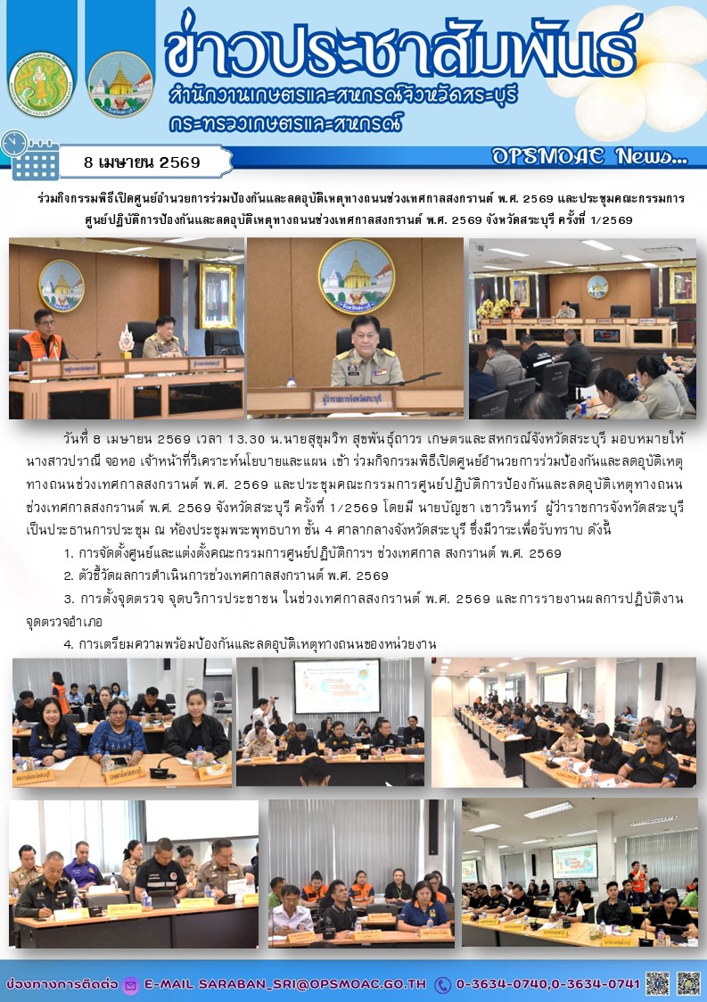 วันที่ 8 เมษายน 2569 เวลา 13.30 น.นายสุขุมวิท สุขพันธุ์ถาวร เกษตรและสหกรณ์จังหวัดสระบุรี มอบหมายให้ นางสาวปราณี จอหอ เจ้าหน้าที่วิเคราะห์นโยบายและแผน เข้า ร่วมกิจกรรมพิธีเปิดศูนย์อำนวยการร่วมป้องกันและลดอุบัติเหตุทางถนนช่วงเทศกาลสงกรานต์ พ.ศ. 2569 และประชุมคณะกรรมการศูนย์ปฏิบัติการป้องกันและลดอุบัติเหตุทางถนน ช่วงเทศกาลสงกรานต์ พ.ศ. 2569 จังหวัดสระบุรี ครั้งที่ 1/2569 โดยมี นายบัญชา เชาวรินทร์ ผู้ว่าราชการจังหวัดสระบุรี เป็นประธานการประชุม ณ ห้องประชุมพระพุทธบาท ชั้น 4 ศาลากลางจังหวัดสระบุรี ซึ่งมีวาระเพื่อรับทราบ ดังนี้