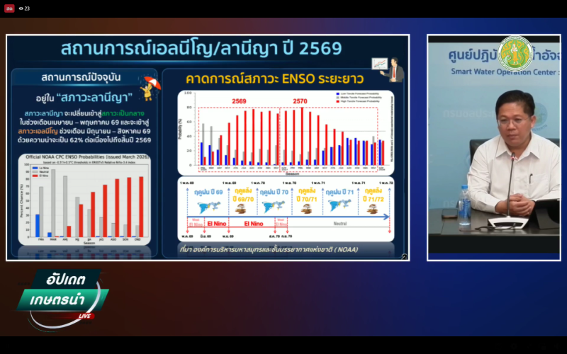ผู้อำนวยการสำนักบริหารจัดการน้ำและอุทกวิทยาฯ ได้กล่าวถึงการบริหารจัดการน้ำล่วงหน้า 2 ปี ว่ากรมชลประทานได้ติดตามและเริ่มสำรองน้ำต้นฤดูฝนในช่วงเดือนพฤษภาคม - มิถุนายน 2569 รับมือสถานการณ์เอลนีโญทิ่จะเกิดขึ้นและสถาการณ์ภัยแล้งในปีถัดไป โดยหากทุกภาคส่วนไม่ว่าจะเป็นหน่วยงานรัฐ เอกชน เกษตรกรและประชาชนในพื้นที่ เข้ามามีส่วนร่วมในการบริหารจัดการน้ำร่วมกันจะสามารถช่วยลดผลกระทบหรือการขาดแคลนน้ำได้อย่างยั่งยืน