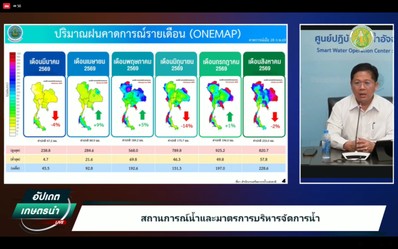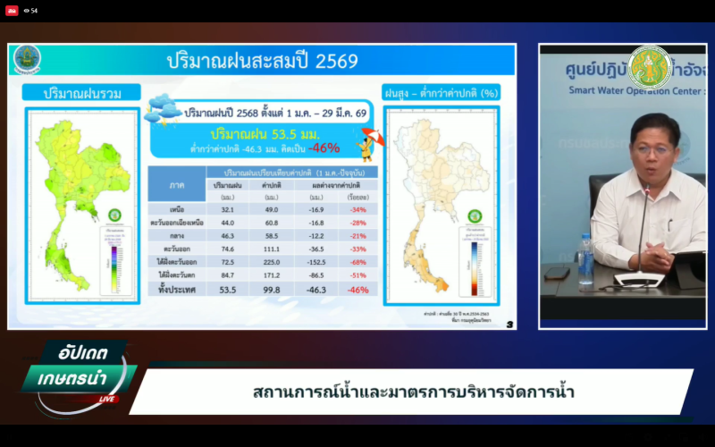 ผู้อำนวยการสำนักบริหารจัดการน้ำและอุทกวิทยาฯ ได้กล่าวถึงปริมาณฝนที่ตกในประเทศไทยและปริมาณน้ำในอ่างเก็บน้ำว่า ปริมาณน้ำฝนตั้งแต่เดือนมกราคม –มีนาคม พ.ศ. 2569 ที่ผ่านมา มีปริมาณที่ต่ำกว่าค่าเฉลี่ยในทุกภูมิภาคของประเทศไทย ซึ่งทางกรมชลประทานจะมีการเตรียมน้ำสำรองไว้ให้กับกลุ่มเกษตรกรที่จะเริ่มทำการเพาะปลูกในช่วงเดือนพฤษภาคม - มิถุนายน ที่อาจจะได้รับผลกระทบจากฝนที่ตกลดลง ส่วนปริมาณน้ำในอ่างเก็บน้ำทั่วประเทศ ภาพรวมยังมีปริมาณมากกว่าปีที่ผ่านมาโดยยังสามารถสนับสนุนในทุกกิจกรรม อย่างเพียงพอ ไม่ว่าจะเป็นการอุปโภค-บริโภค การใช้น้ำทำการเกษตร และการใช้น้ำในช่วงกิจกรรมวันสงกรานต์ที่จะมาถึงนี้